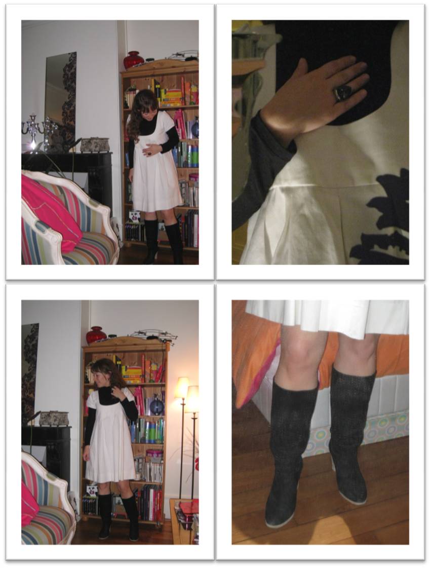 La petite robe est donc signée Maje, le sous-pull Petit Bateau (et dire que je refusais d’en porter étant petite…) et les bottes sont ma jolie trouvaille de la vente privée Comptoir des Cotonniers où j’ai été vendredi soir. C’était la guerre dans les bacs à pulls (made in China…beurk, beurk, beurk!!!!), mais c’était la fête dans les boîtes à chaussures.