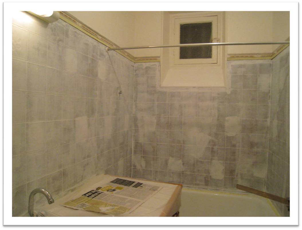 Après 1h30 de travail la salle-de-bain ressemble à ça, et même si c’est très grunge dans la finition, c’est toujours mieux que les horribles carreaux marrons.