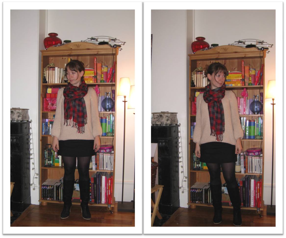 La jupe est une jupette très 60’s signée Tara Jarmon (je vous montrerai un de ces jours prochains), le pull c’est mon antique pull Vanessa Bruno que j’aime d’amour depuis…4 ou 5 ans et les bottes c’est Comptoir bien sûr! Ah et le foulard c’est Zara, très doux, bien douillet.
