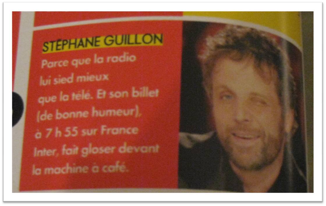 Stéphane Guillon c’est un gentil trublion qui me fait bien rire tous les matins à l’heure où j’essaie de mettre mon mascara (essayez de mettre du mascara en riant vous allez voir comme c’est facile) et que je promène ensuite dans mon ipod. Et bien voilà, ELLE aussi est fan de ses pétages de plombs matinaux. Excellent pour le moral, je recommande. Ah, c’est sur France Inter, le matin à 7h55, dans la matinale de Nicolas Demorand sans qui je ne peux pas me réveiller (et non Mr Papillon n’est pas jaloux).