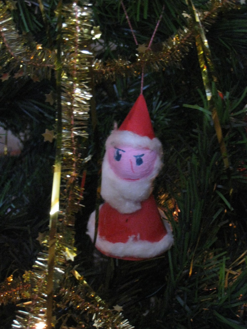 Je suis chaque année qui passe plus émue d’accrocher dans l’arbre mon petit Père Noel cuvée 1982 ou 1983, une relique de ma petite enfance et de ma découverte de l’école. Il n’est plus très frais, mais il est probablement ma décoration de Noël préférée.