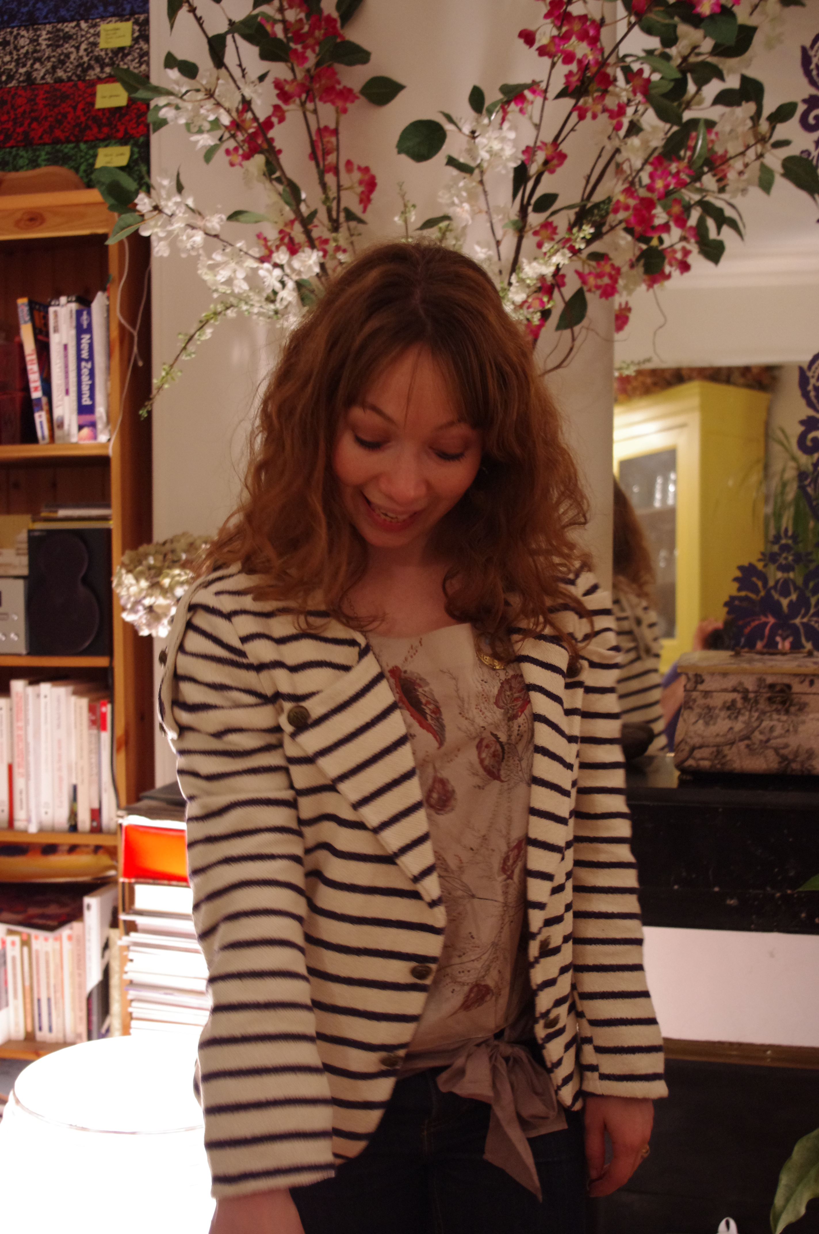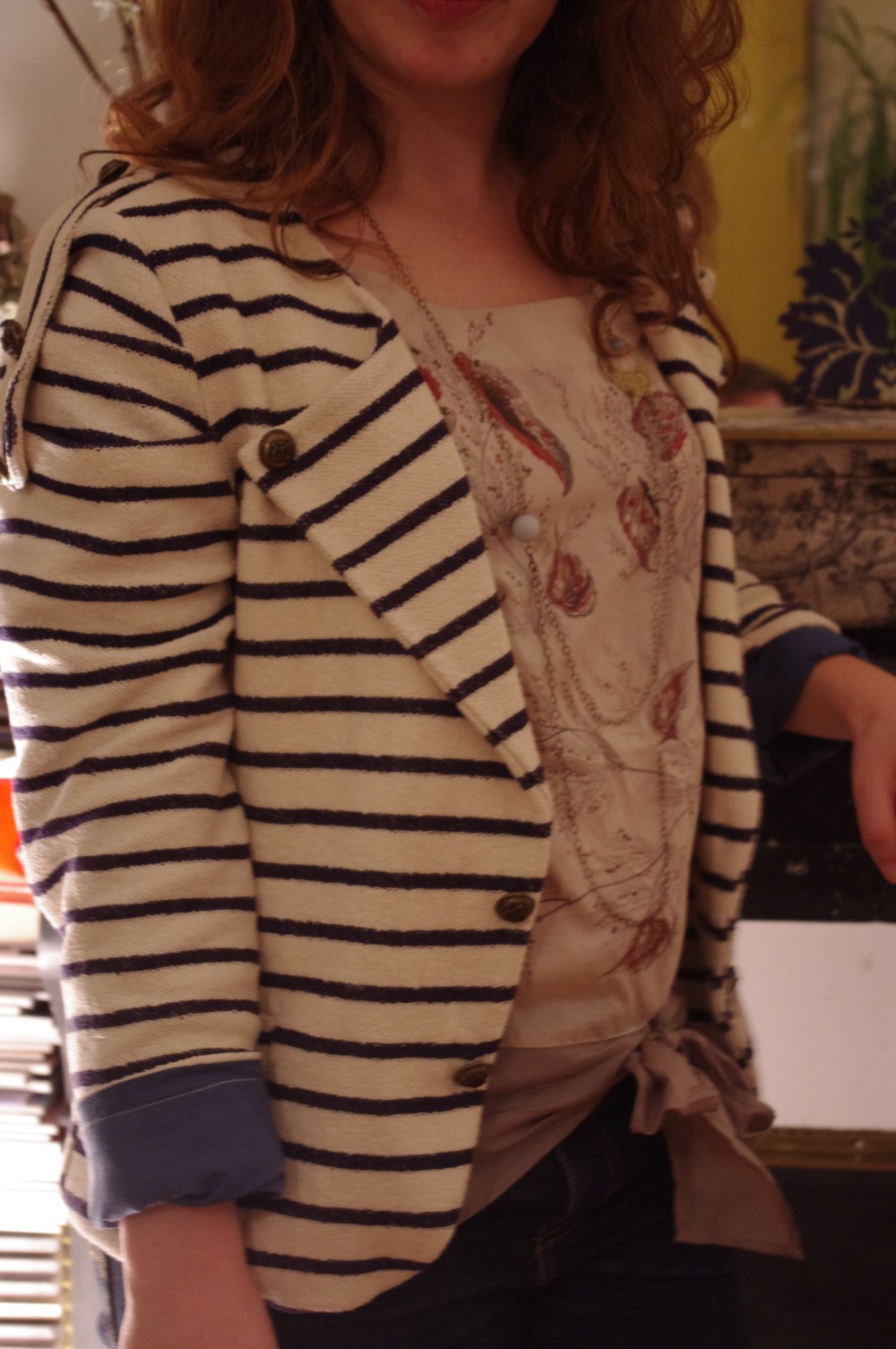J’aime son tissu épais et brut, ses rayures empruntées aux marins, ses boutons et ses fronces sur les épaules.