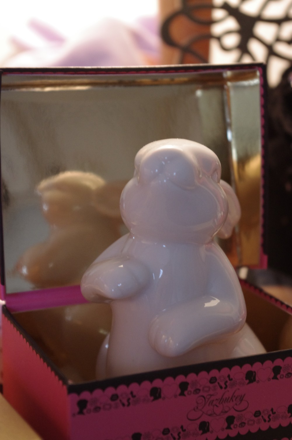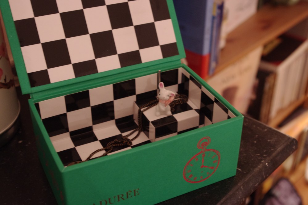 Depuis que la boîte Alice de Ladurée est entrée dans l’appartement, c’est devenu le lieu de résidence musicale de Mr Lapinou. L’une de mes mini-joies est devenue depuis de soulever le couvercle pour entendre la petite ritournelle d’Alice et saluer le lapin blanc.