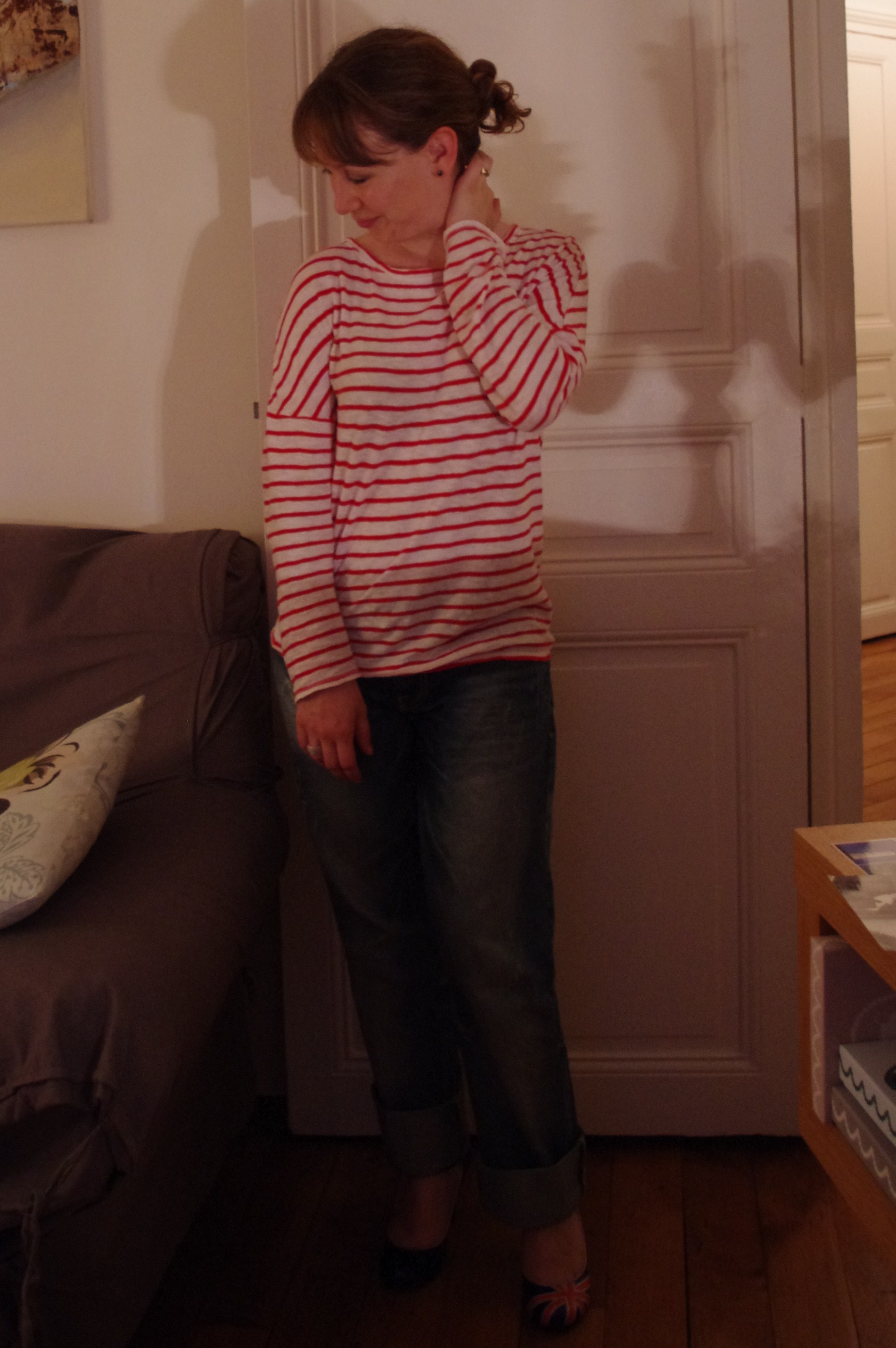 Tellement simple, qu’on dirait le mien quand j’étais à Paris, les rayures en moins (c’est pas que la marinière ne me plait pas, c’est que des rayures horizontales avec mon tour de poitrine, ce serait suicidaire) .
