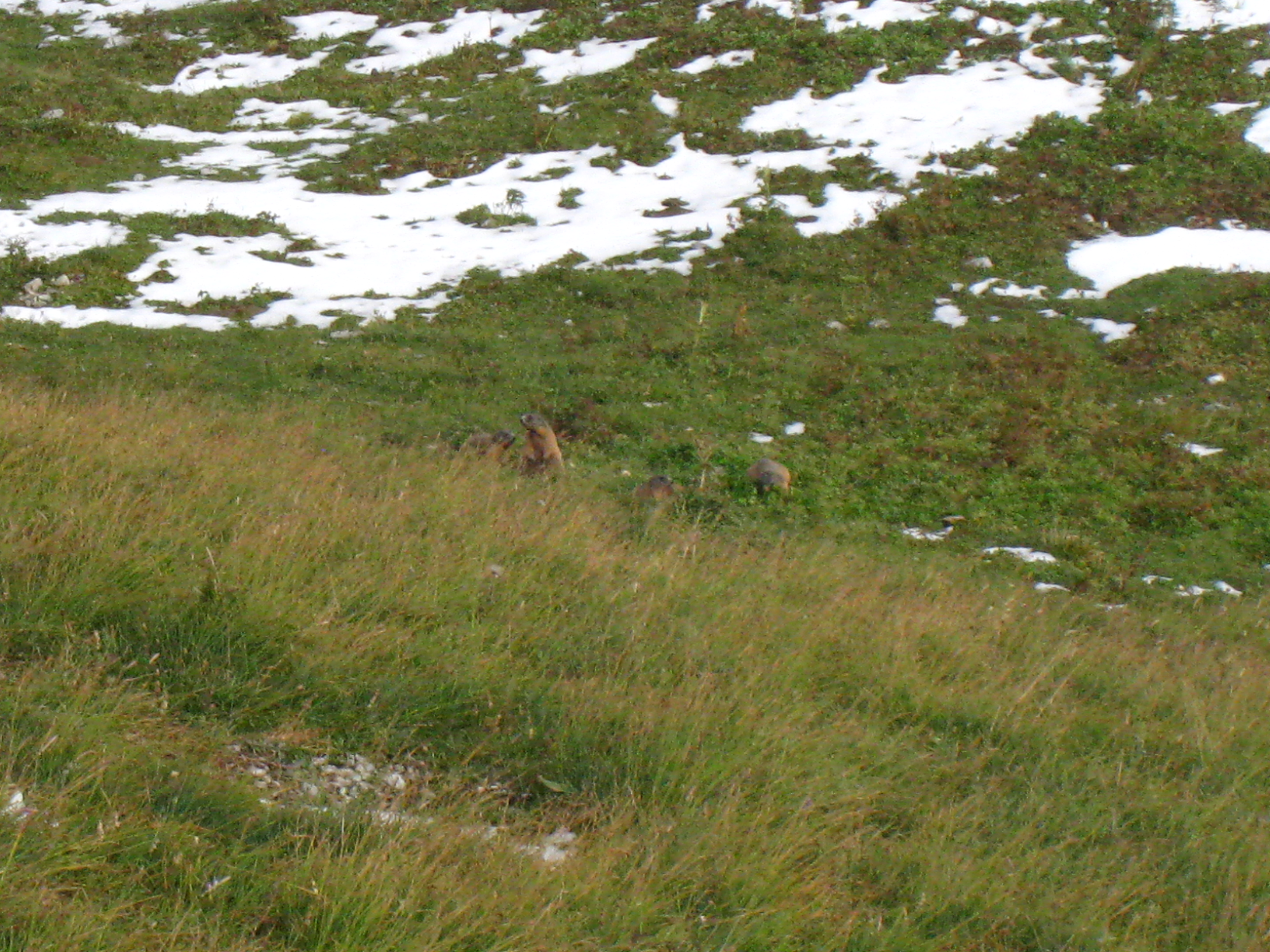 Un groupe de petites marmottes occupées à se gaver d’herbe fraiche pendant qu’il en est encore temps car comme vous pouvez le constater, il y a déjà de la neige.