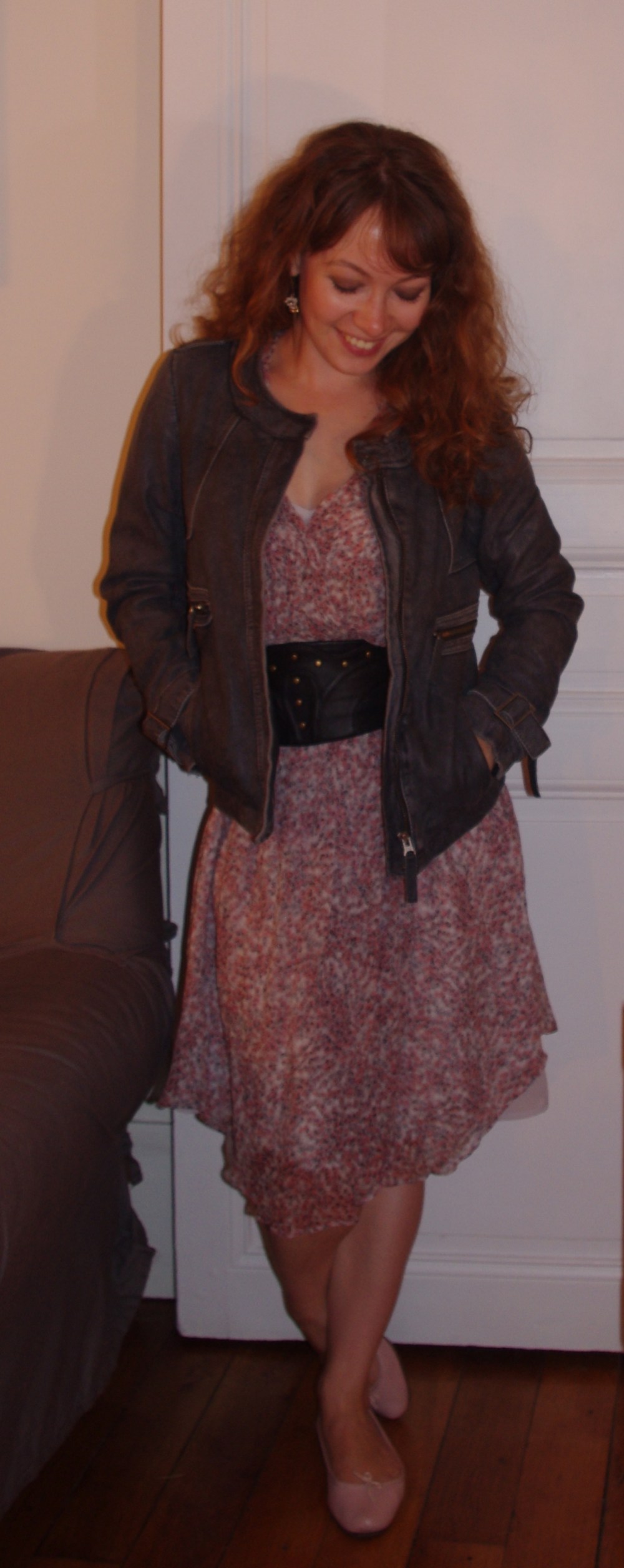 J’ai déniaisé la robe en mousseline de soie avec ma grosse ceinture en cuir façon corset et équilibré mes ballerines roses (ahem, oui, toujours la même maison) avec le cuir gris brut.