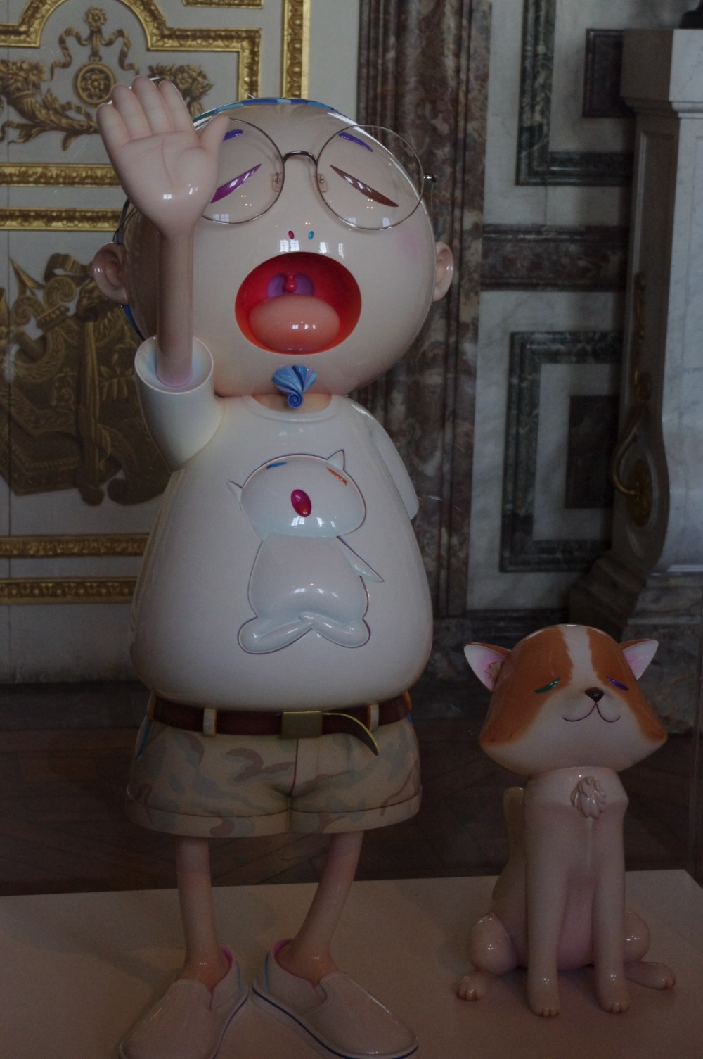 Ce petit personnage est sensé être Murakami lui-même, accompagné de son petit chien. Il est présenté avec deux autres petits personnages, aux visages tout aussi lunaires…