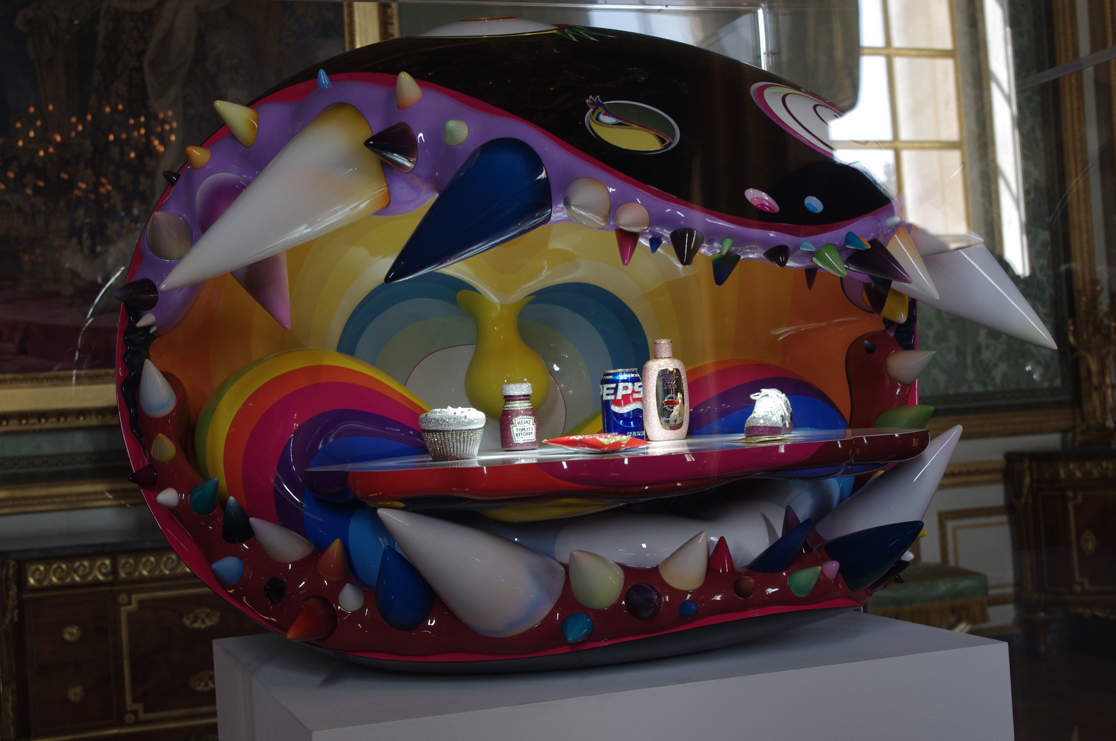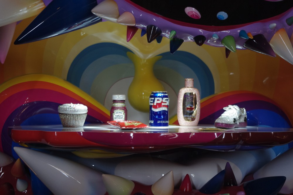 Des objets de grande consommation uniquement (un cupcake de chez Magnolia Bakery, du ketchup, du Pepsi, une basket de je ne sais plus quelle marque, un préservatif, des chips et une lotion pour bébé. En diamants, saphirs, rubis et autres pierreries un peu couteuses.