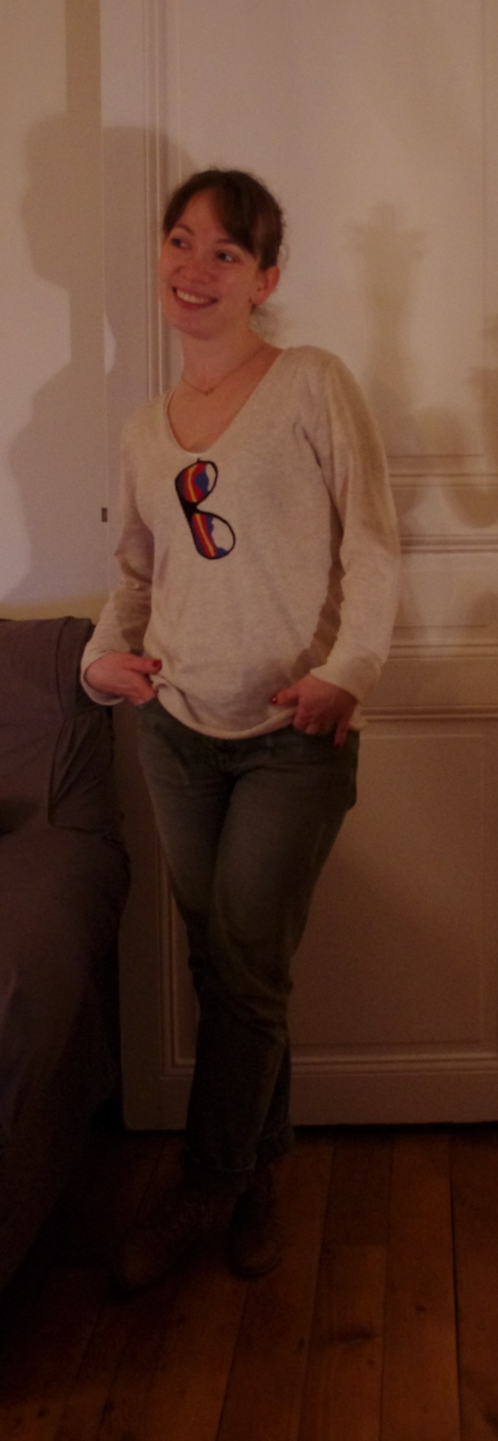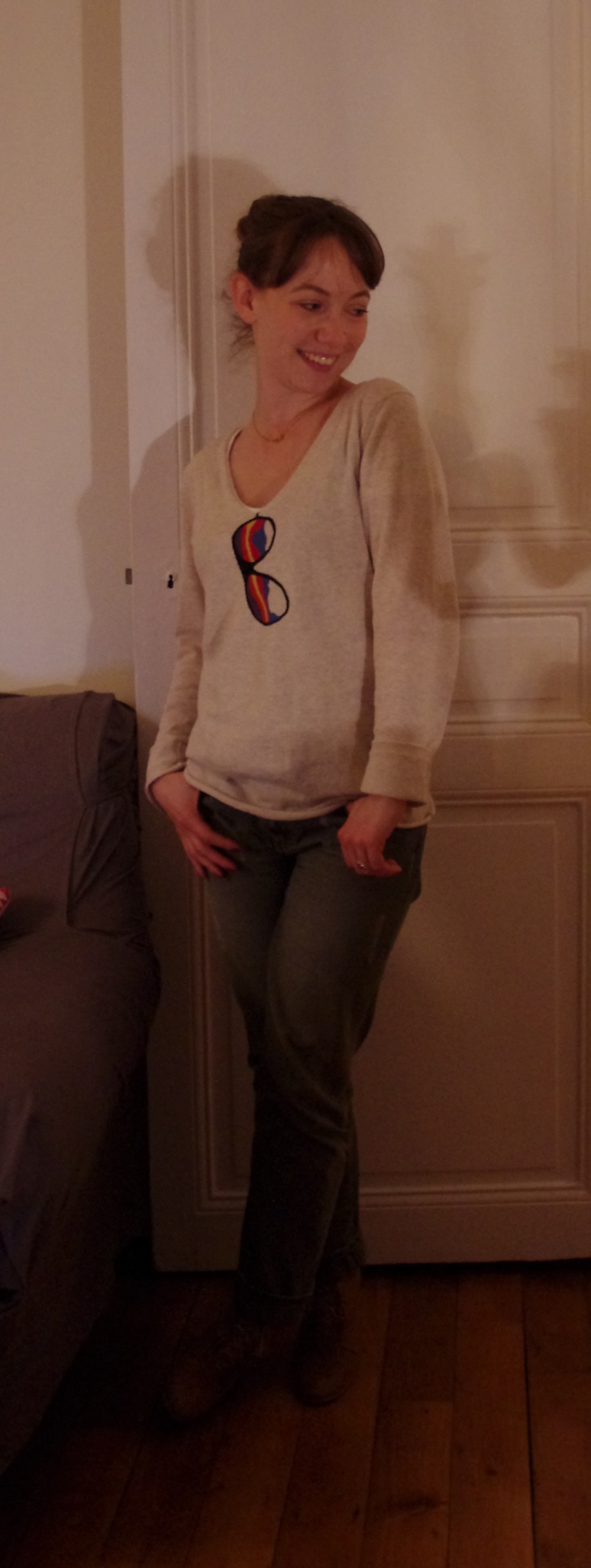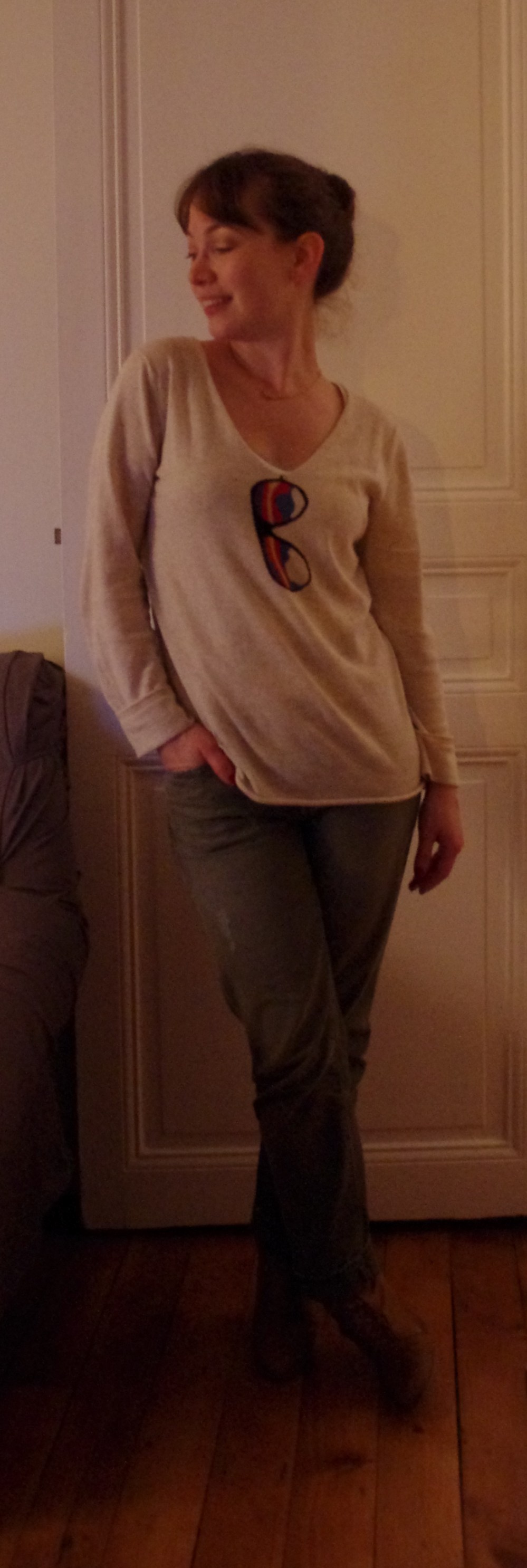 Pas très originale cette silhouette, mais ce jean est l’un de mes chouchous, j’adore le décolleté et les lunettes du pull qui me fait – en plus – penser à mon amie Camille et ces petites compensées (j’ai acheté des chaussures chez Zara, non mais franchement!) sont des pantoufles intuables!