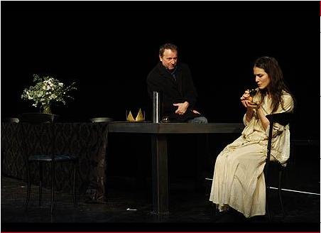 Et puis les comédiens qui « habillent » et « déshabillent » à loisir cette table. Une coupe de fruit, un vase et un bouquet de fleurs, un plateau couvert de verres ou de bouteilles d’alcool, des journaux…