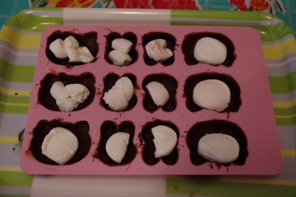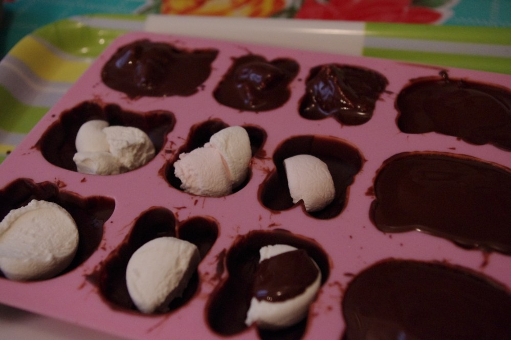 Une couche de chocolat au fond des moules, quelques minutes au froid, un peu de guimauve, puis le reste du chocolat fondu sur la tronche de la guimauve. Et frigo pendant 4h.