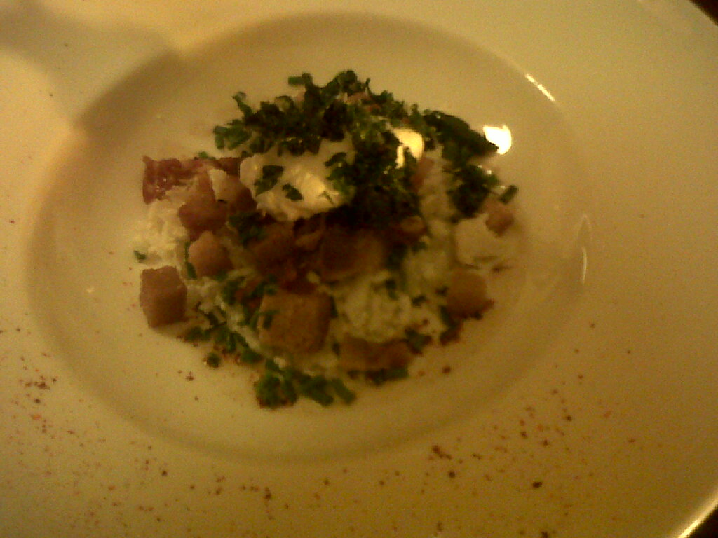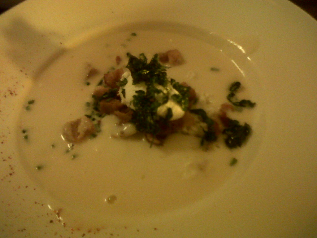 Velouté au deux céleris, avec petits croutons de pain à l’ail, petits lardons grillés, pointe de crème fraîche et piment d’Espelette