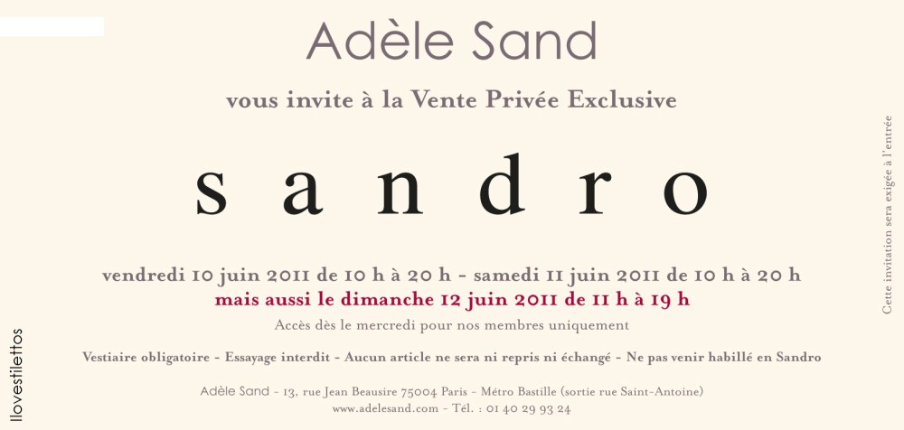 2 juin 2011 Vente privée Sandro Bonnes adresses, Shopping 0 Comments Maje, Ba&sh, Vanessa Bruno, maintenant Sandro, c’est un festival de jolies ventes privées chez Adèle Sand! Celle-ci aura lieu du 10 au 12 Juin inclus, enjoy!! Clic, clic, clic pour l’imprimer! Évaluez ceci :Partager : Cliquer pour partager sur X(ouvre dans une nouvelle fenêtre) X Cliquer pour envoyer un lien par e-mail à un ami(ouvre dans une nouvelle fenêtre) E-mail Cliquez pour partager sur Facebook(ouvre dans une nouvelle fenêtre) Facebook Cliquez pour partager sur Tumblr(ouvre dans une nouvelle fenêtre) Tumblr Cliquez pour partager sur Pinterest(ouvre dans une nouvelle fenêtre) Pinterest J’aime chargement… Similaire Anne