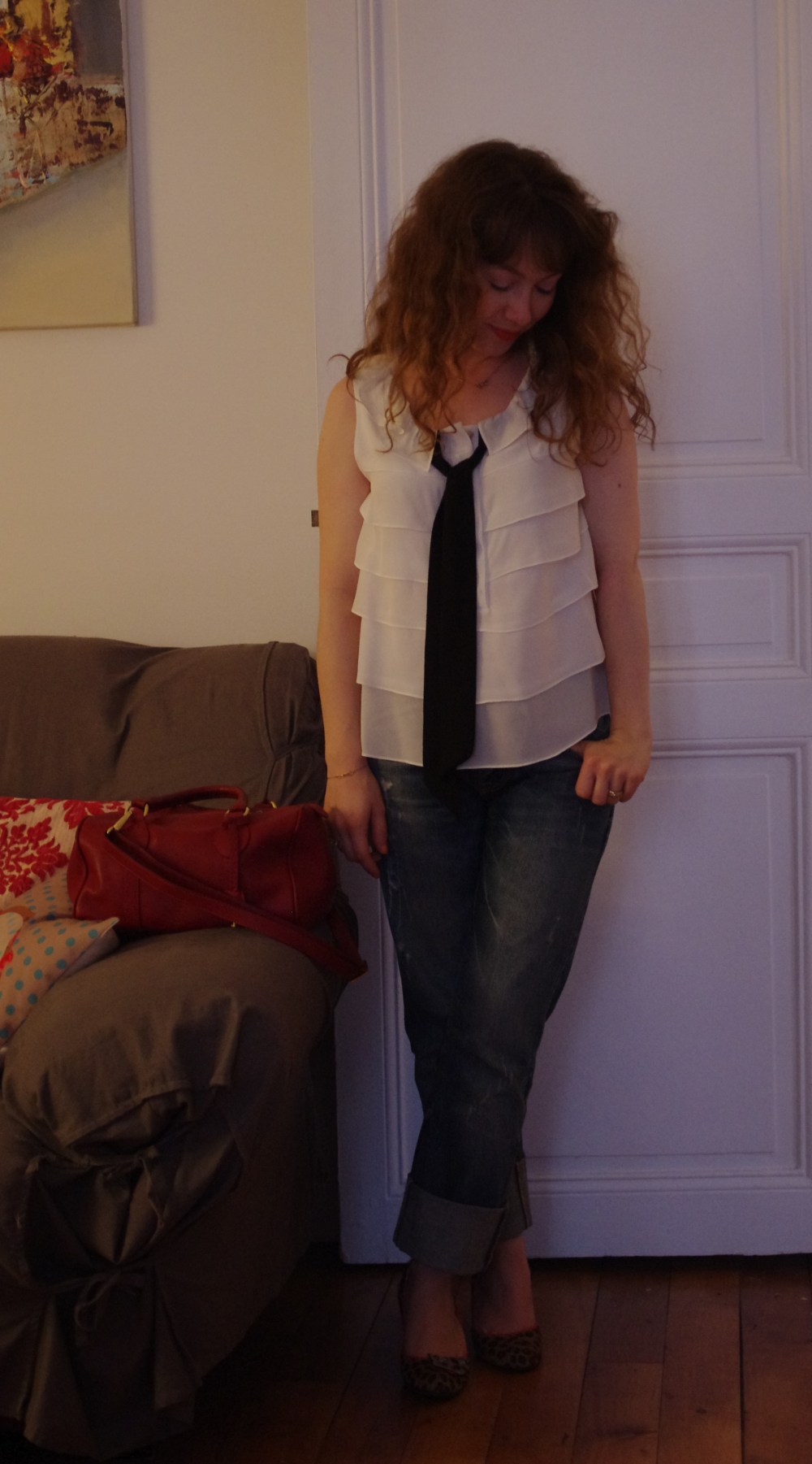 1. euh prévisible, c’est toi qui le dis: j’aime bcp justement le côté imprévisible de la cravate sur un top qui n’en a pas « techniquement » besoin (c’est pas une chemise, je veux dire). TRès mignon!
