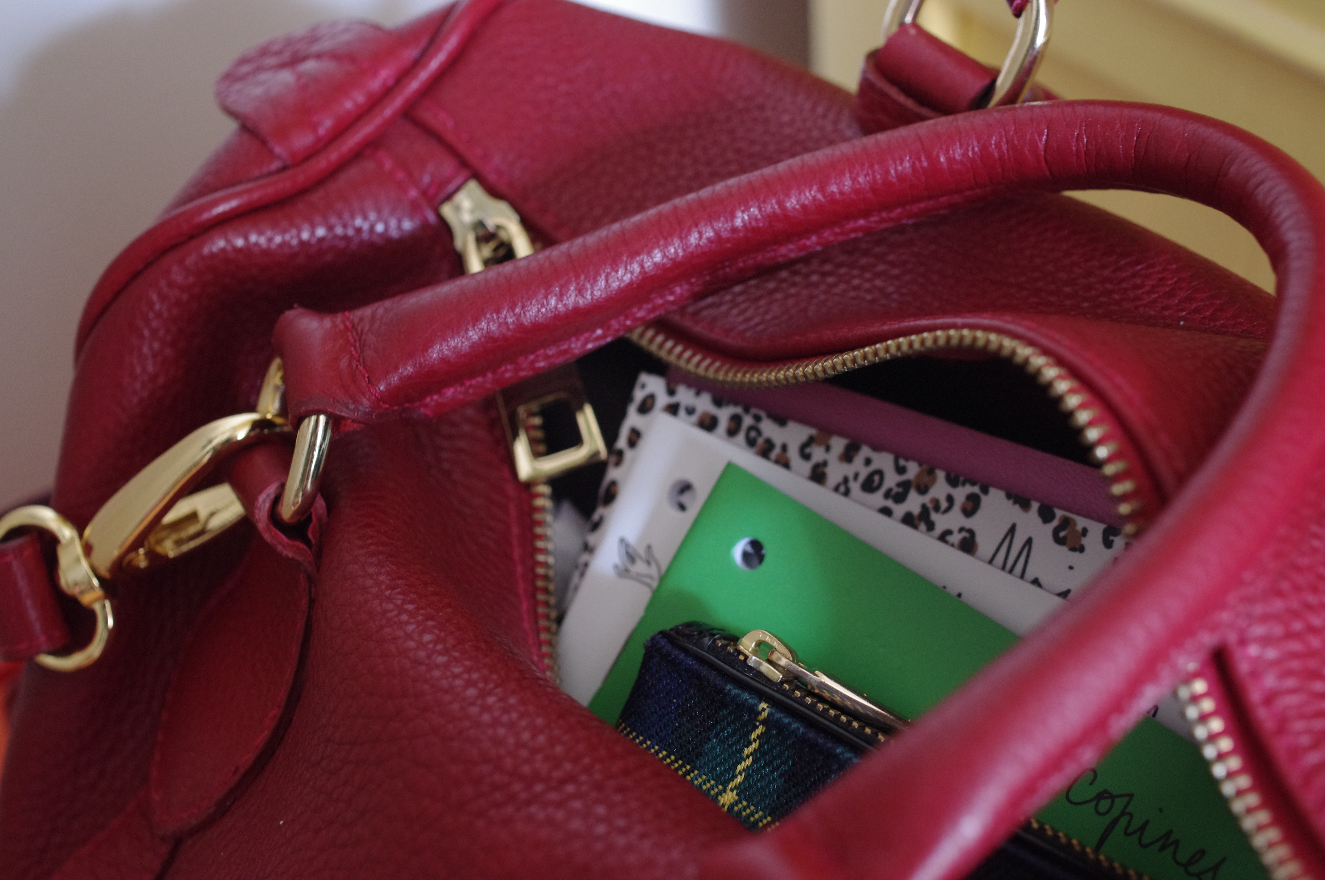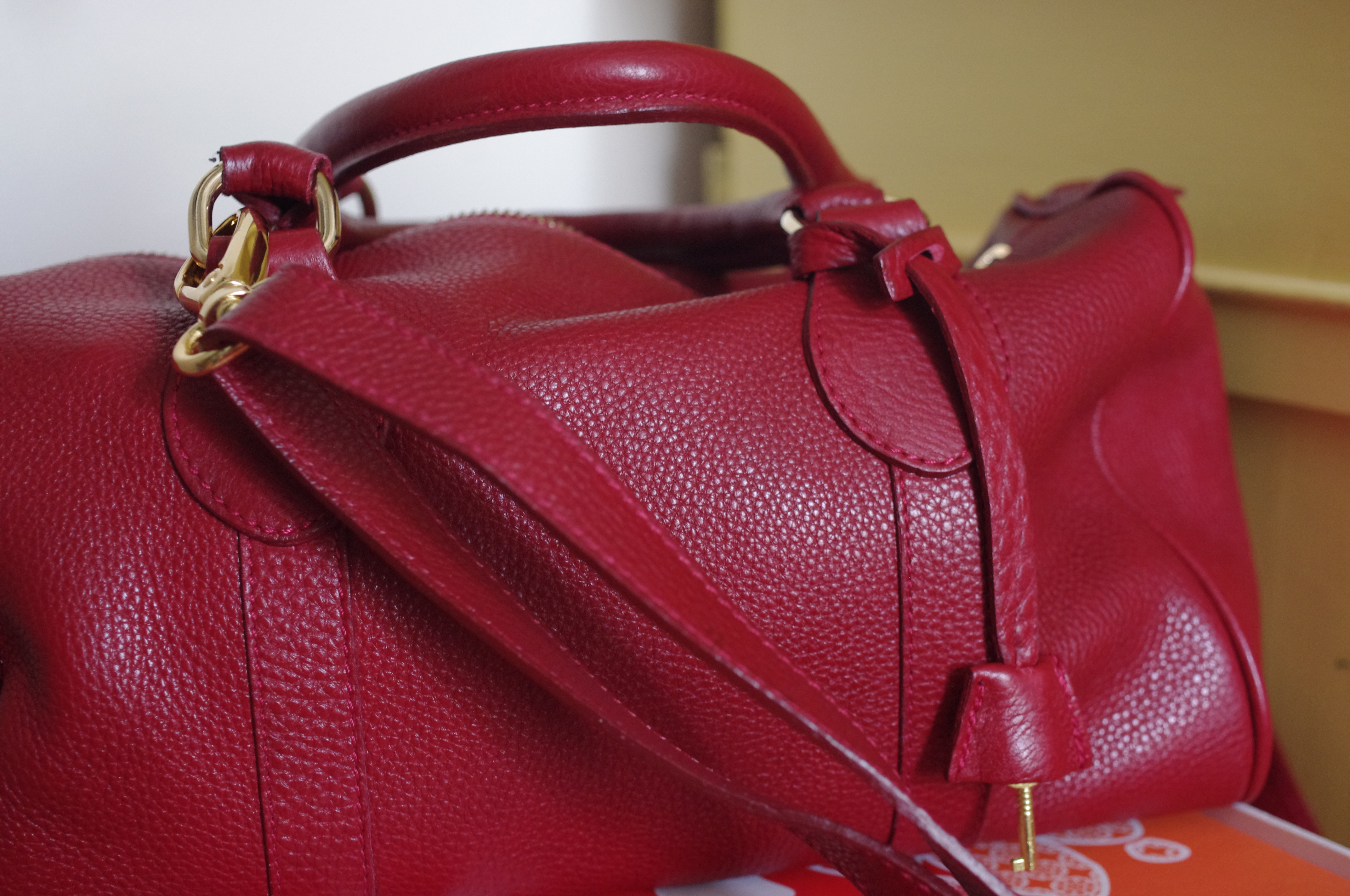 J’aime son rouge profond, sa forme très classique, sa taille si pratique, son cuir doux et souple.