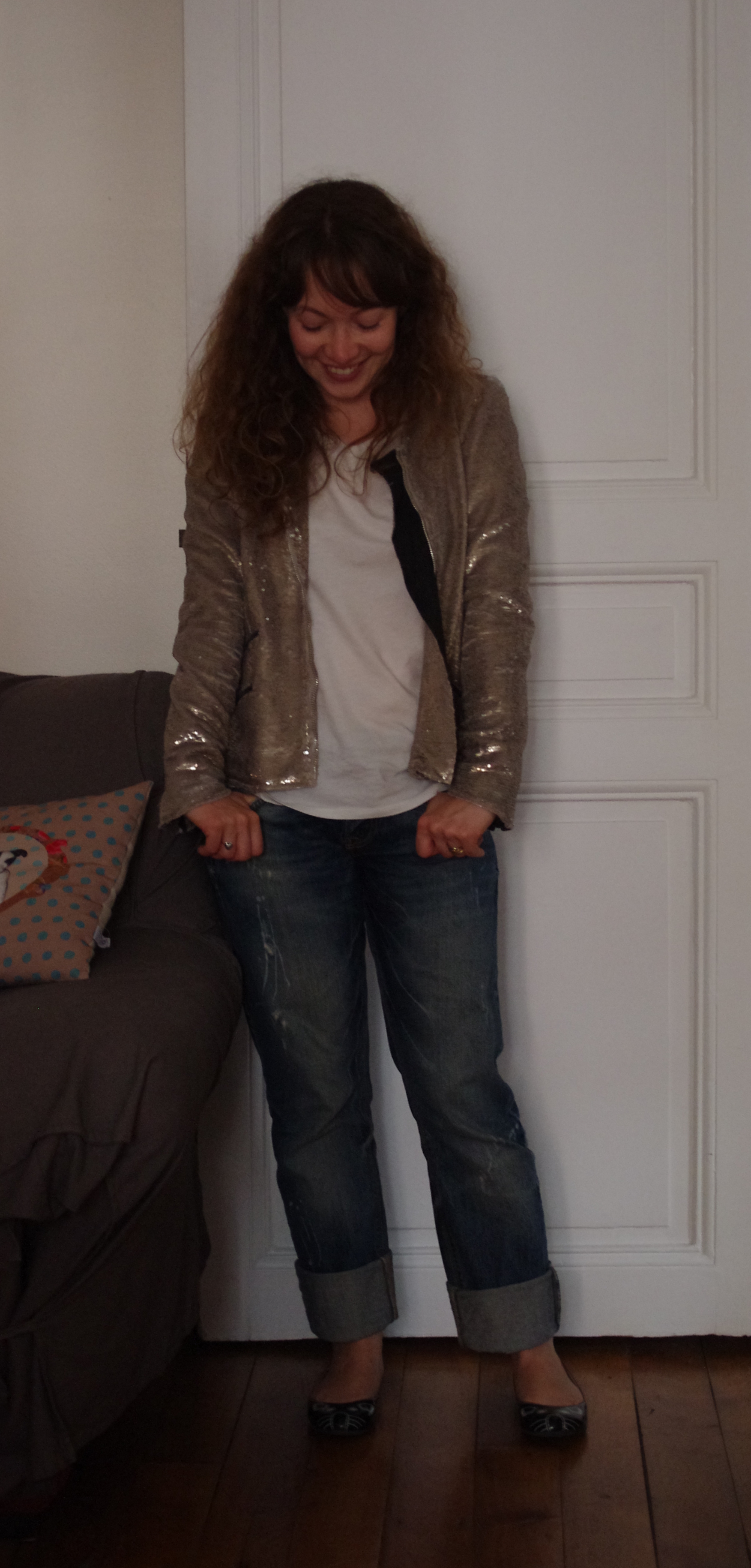 Alors quoi de mieux pour réveiller cette habituelle addition fétiche « jean + t-shirt + ballerines = bonheur vestimentaire », qu’un blouson très brillant ?