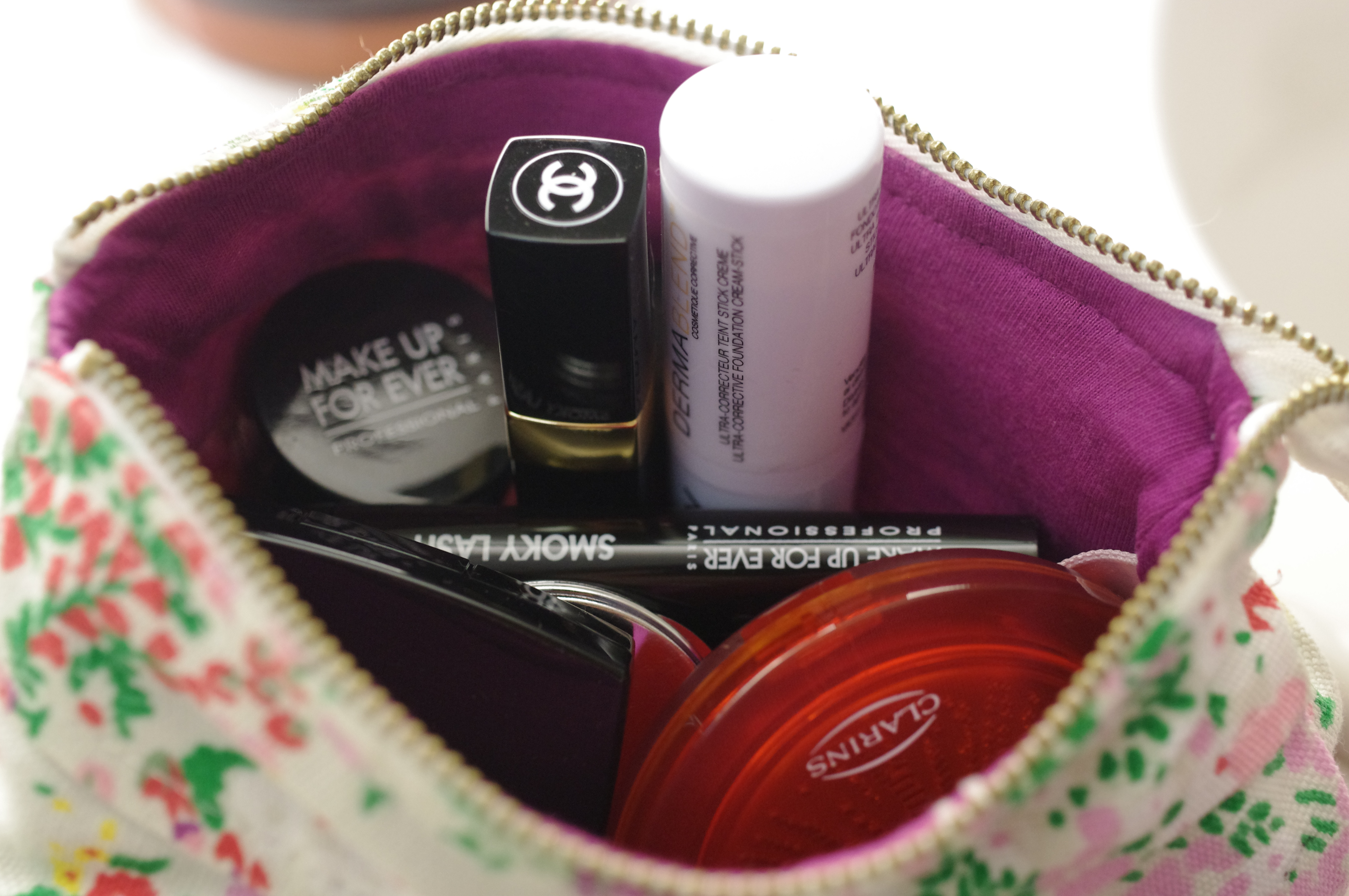 Je suis partie avec une mini-trousse et quelques essentiels: poudre de soleil claire, correcteur, blush, mascara, crayon khôl et rouge à lèvres.