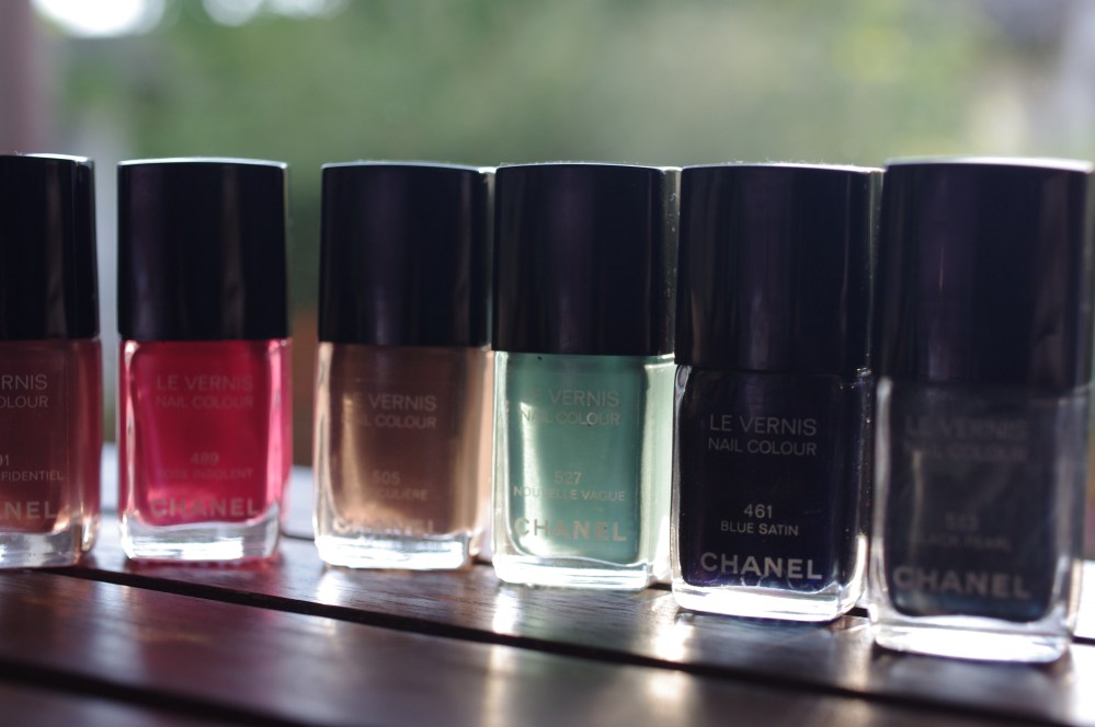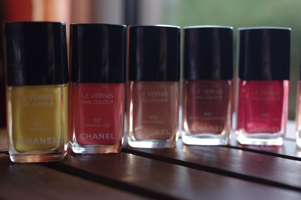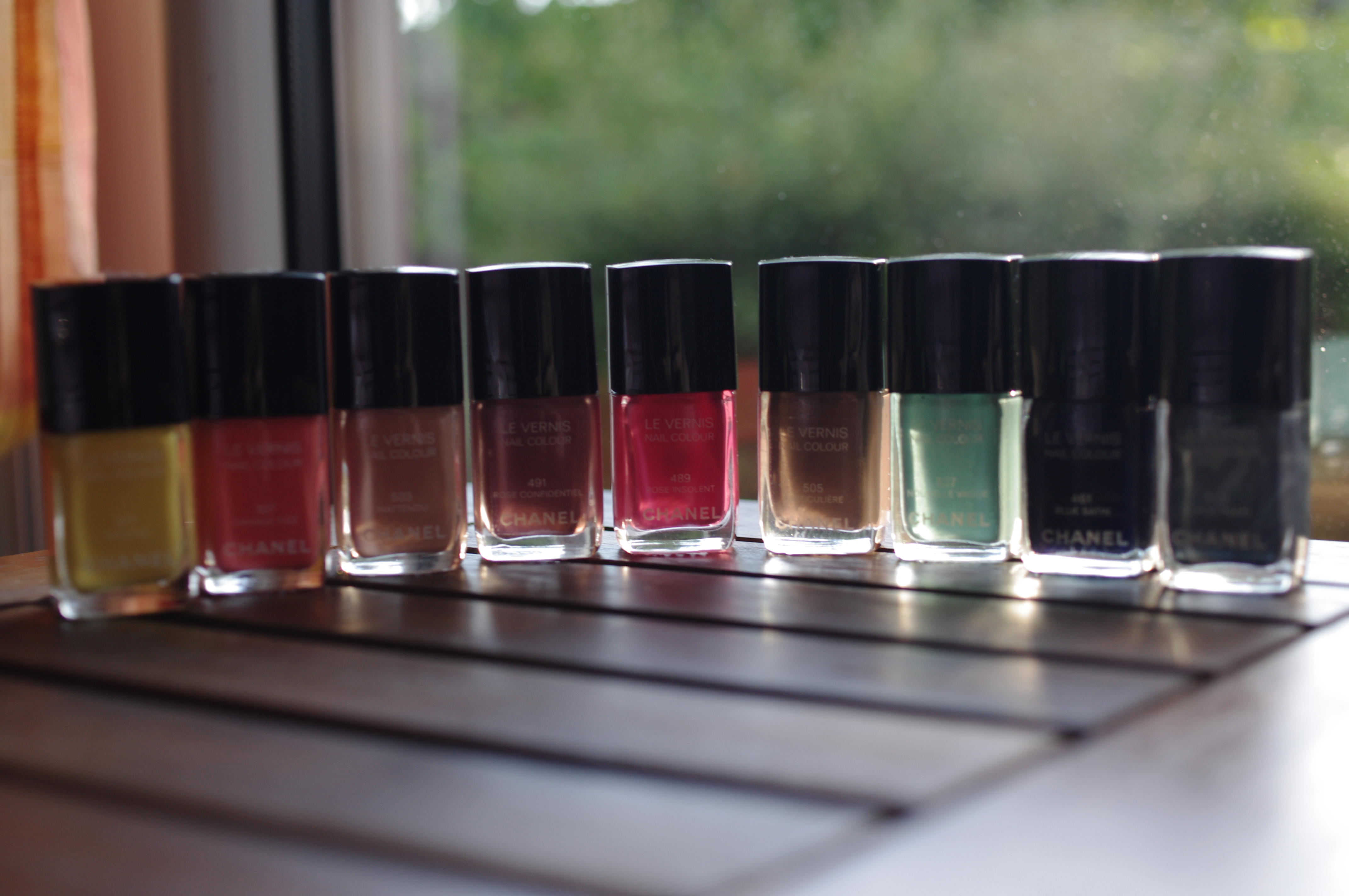 Dans la trousse, du bleu ciel, du bleu nuit, du orange, du jaune, du presque noir, du rose un peu beige… bref de quoi m’amuser, le tout chez Chanel (ne cherchez pas, c’est ma fixette du moment).