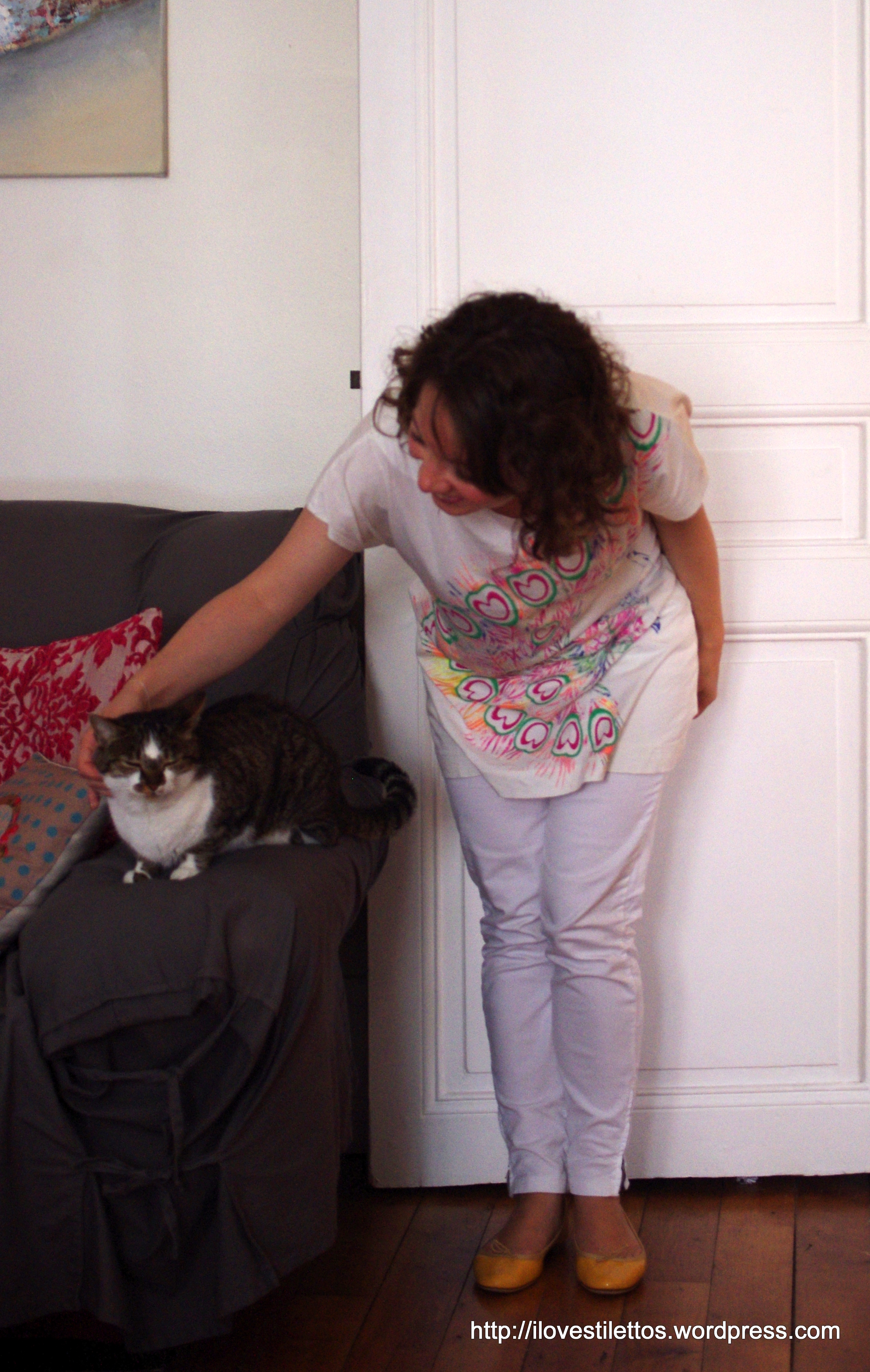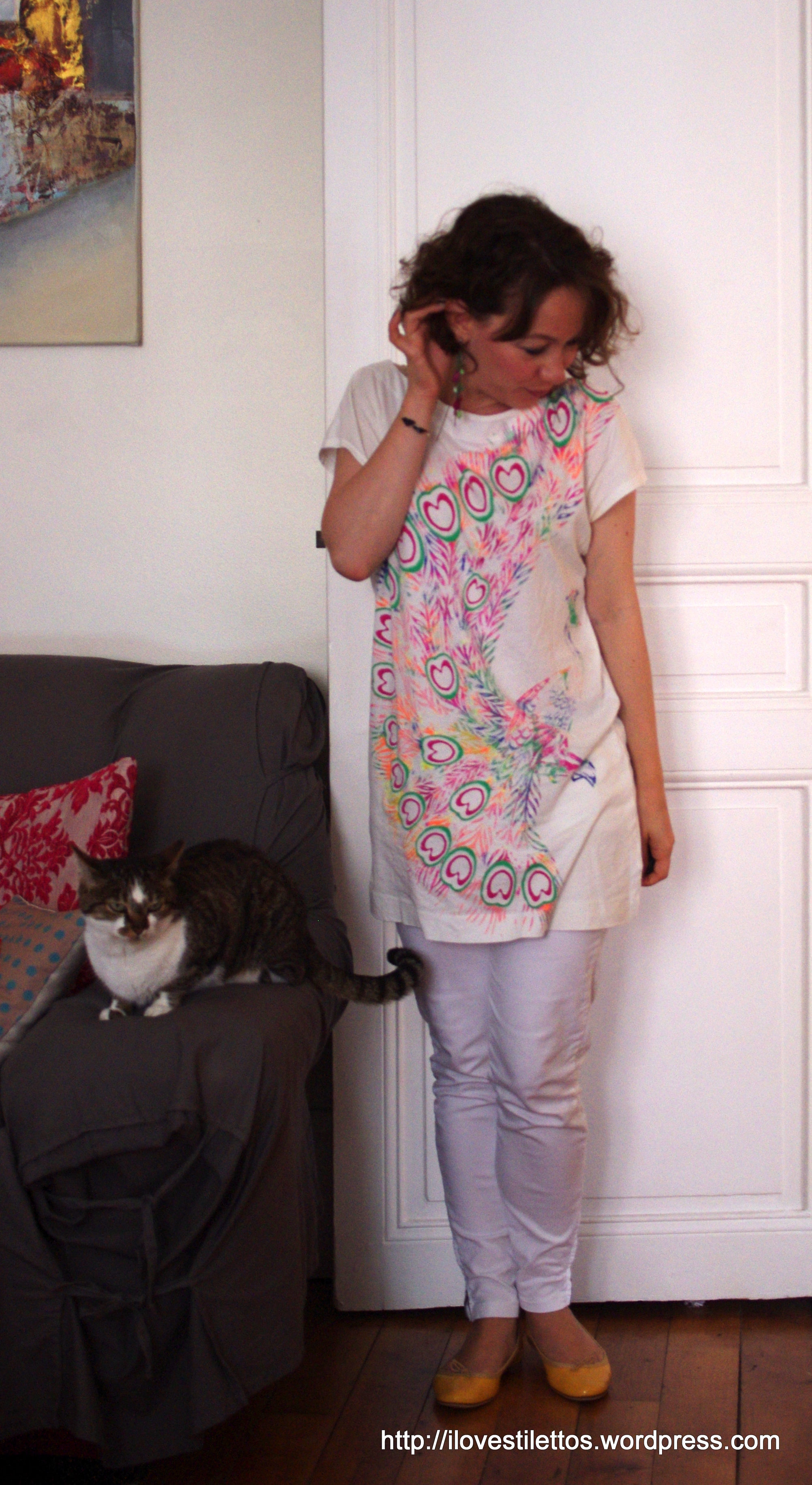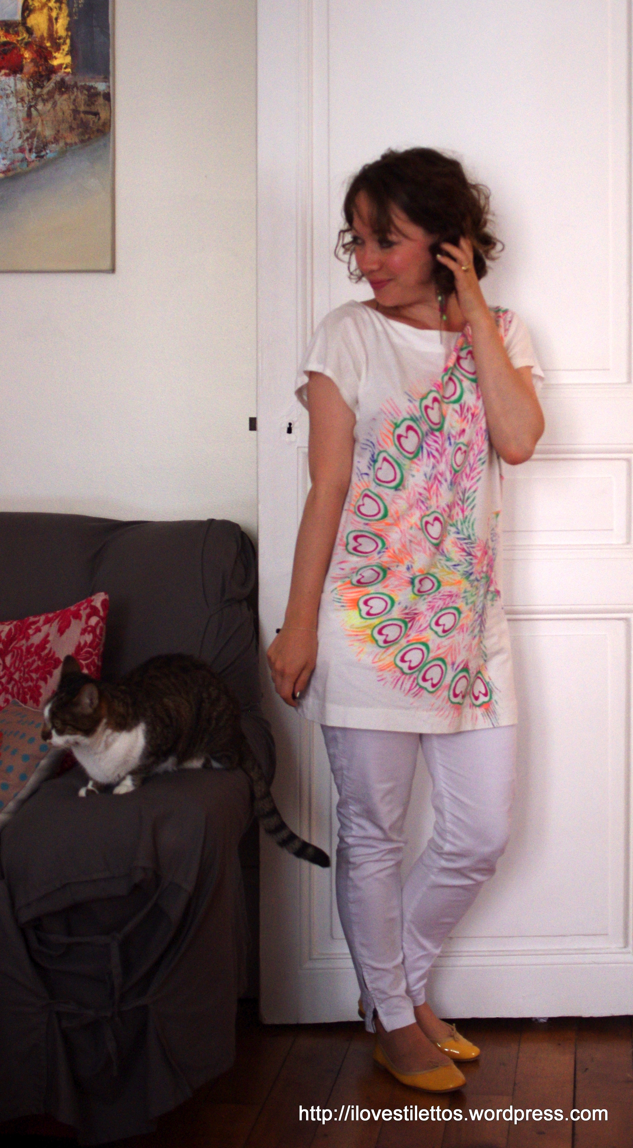 Je ne suis pas satisfaite du résultat pour deux raisons: les 2 blancs de ne sont pas identiques (et donc le t-shirt n’est pas vraiment blanc crotte de bique, je suis furax) et sa coupe n’est pas adapté à ma morphologie, je perds 15 cm avec ça sur le dos (j’ai donc vraiment l’air d’un Schtroupf, rendez-moi mes jambes nom d’une pipe !).