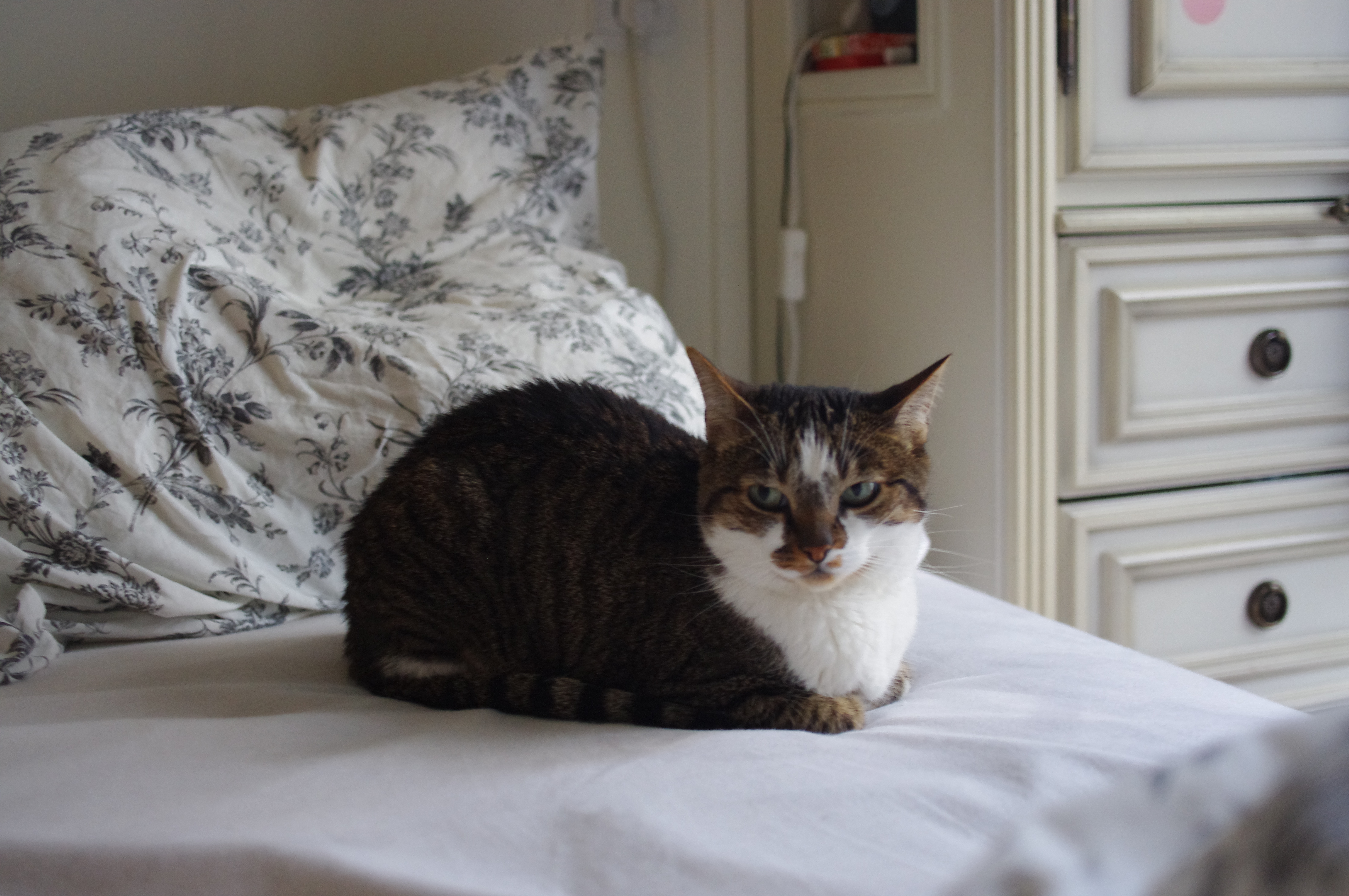 Avant cela elle a contemplé le monde par la fenêtre, réclamé quelques caresses, fait le tour de l’appartement pour s’assurer que tout est bien à sa place (les 2-pattes sur le canapé avec un café « rigolo »).