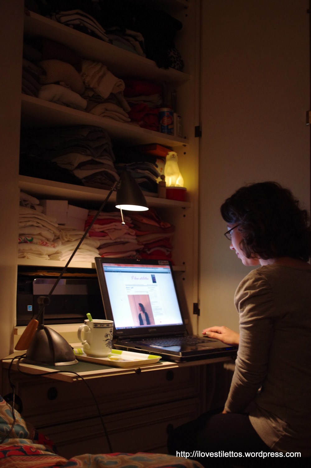 Notre appartement étant trop petit pour accueillir un bureau (snif snif), je bloggue en général de la table basse, du fin fond de mon lit ou de la table de la salle à manger si j’ai besoin de vraie lumière ou d’un sentiment d’un peu plus de professionnalisme (je ne suis pas assise à trois centimètres du sol ou sur un matelas).