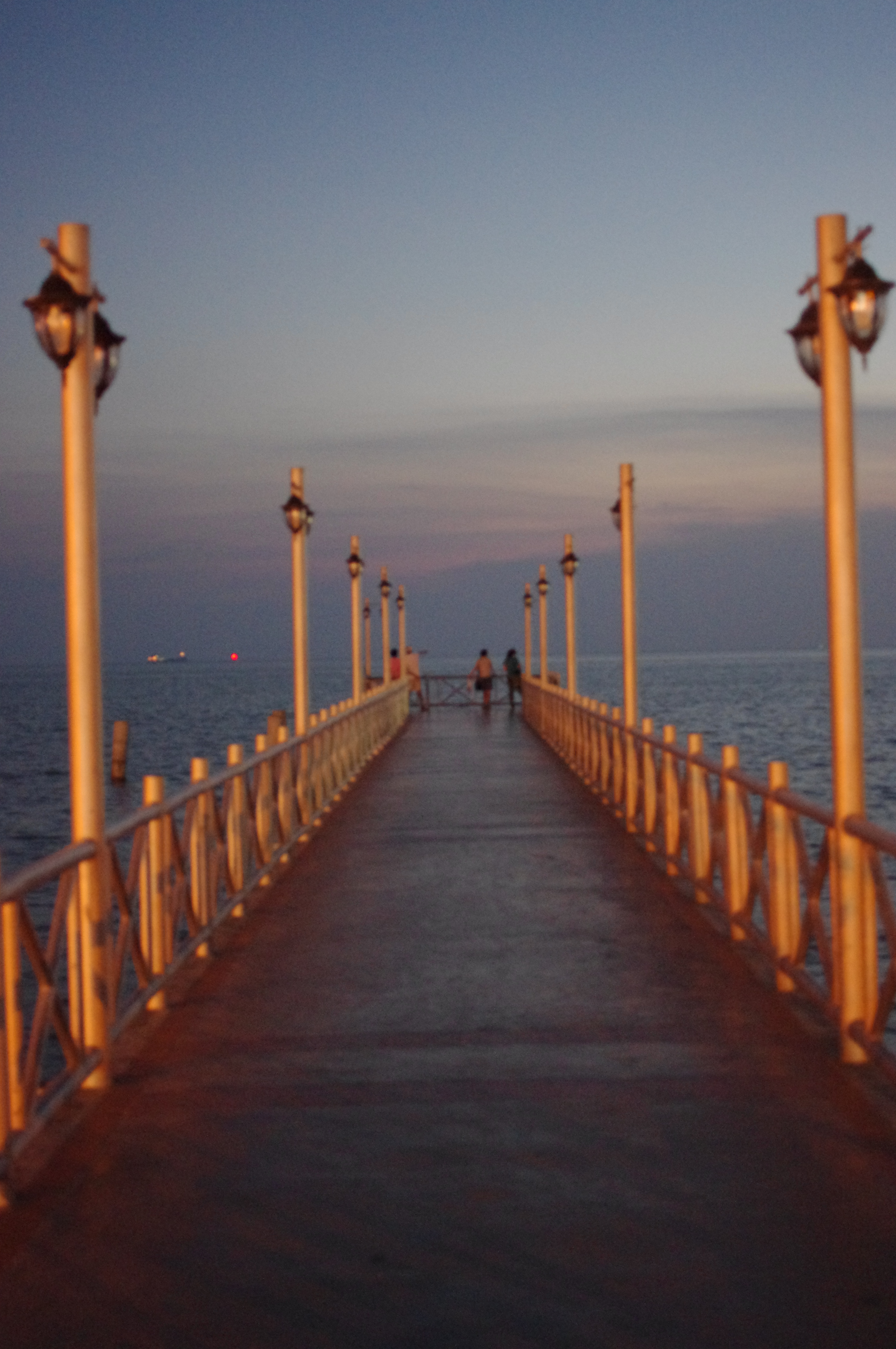 Nous ne attendions pas exactement à ce que nous avons trouvé (même si je n’avais rien de précis en tête). Imaginez une énorme place donnant sur le bord de mer, intégralement squattée par les tables de la dizaine de restaurants installés le long de la place. On rabat le client, on s’interpelle, pas exactement la tradition à laquelle nous pensions. Mais c’est plein de mondes, touristes comme locaux, c’est populaire et ce qu’on y mange est bon. En l’occurrence des crevettes préparées à la locale (cuites dans une pâte de piment) et des crevettes au beurre et à l’ail, accompagnées de riz vapeur et de légumes. Très simple et bon.
