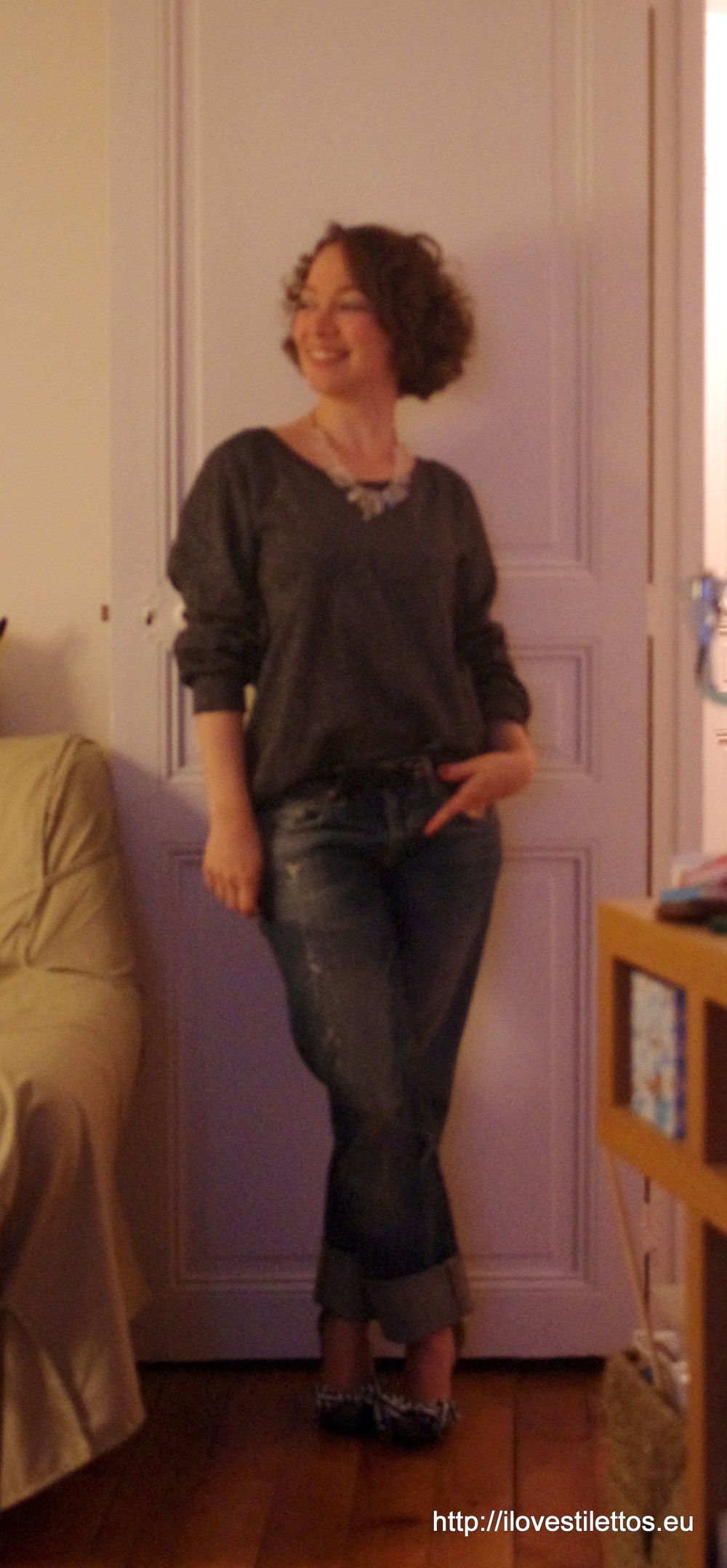 Rien de neuf dans cette tenue, que du vieux, facile et confortable. Seul « effort » remarquable: mes mignonnes chaussures à nœuds (aka les Balibulle puisque c’est à Charlotte que je les dois) et mon collier en cristal.