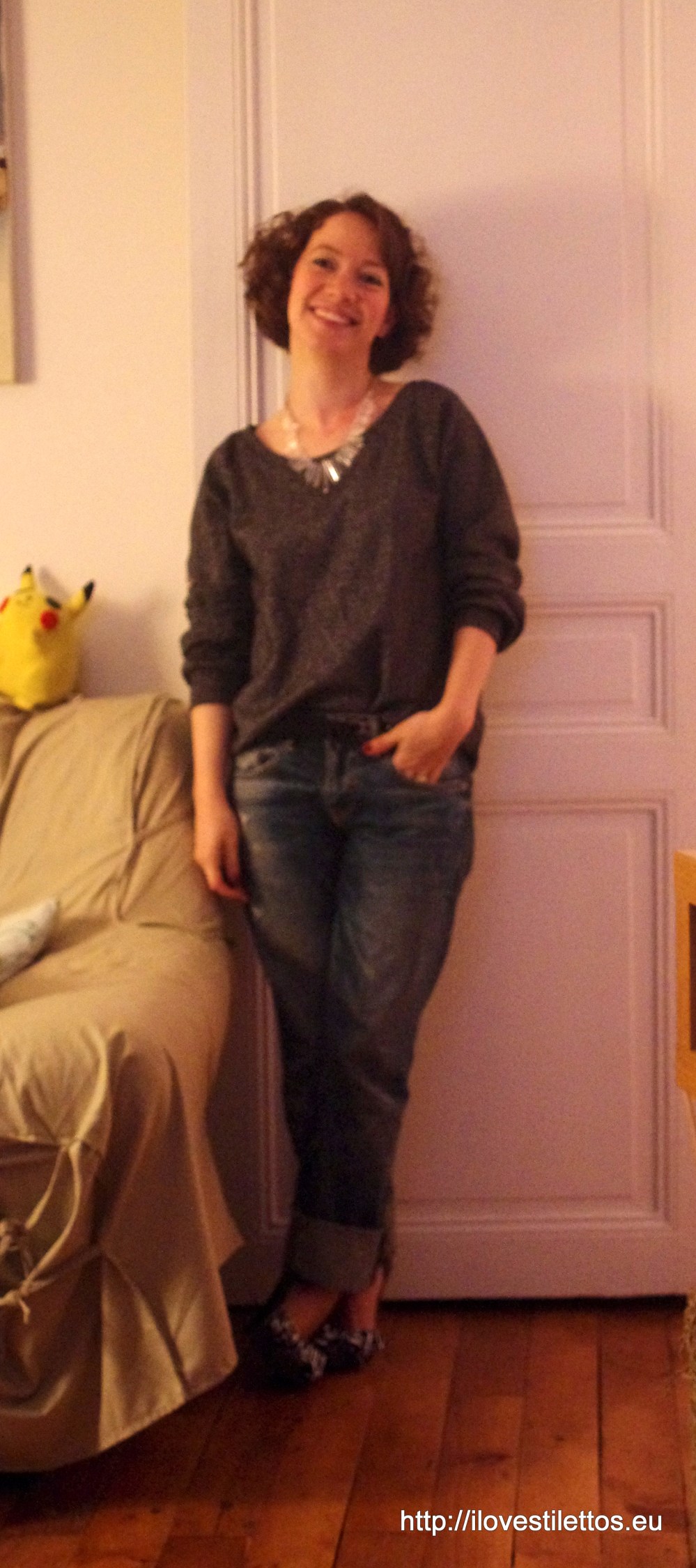 Sweat lurex Vanessa Bruno ; jean LTB ; escarpins KG ; collier Adeline Affre ; vernis Essie « Size matters » ; Pikachu de chaton
