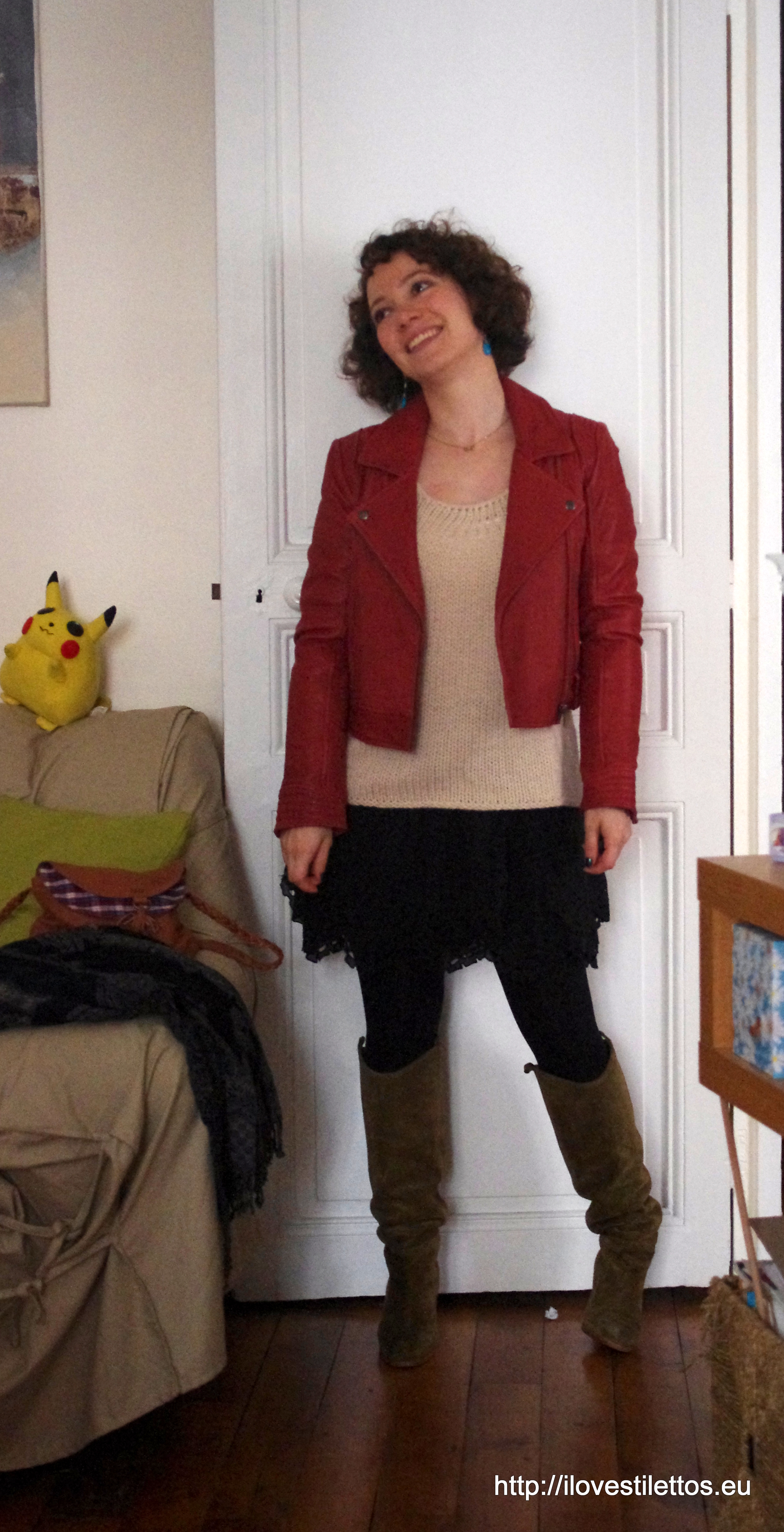 Blouson Sandro ; pull Vanessa Bruno pour La Redoute (une antiquité!!) ; jupe Comptoir des Cotonniers, bottes Isabel Marant ; BO from Singapore ; collier Adeline Affre ; écharpe Zara ; sac Petite Mendigote pour Monoprix ; Pikachu de chaton
