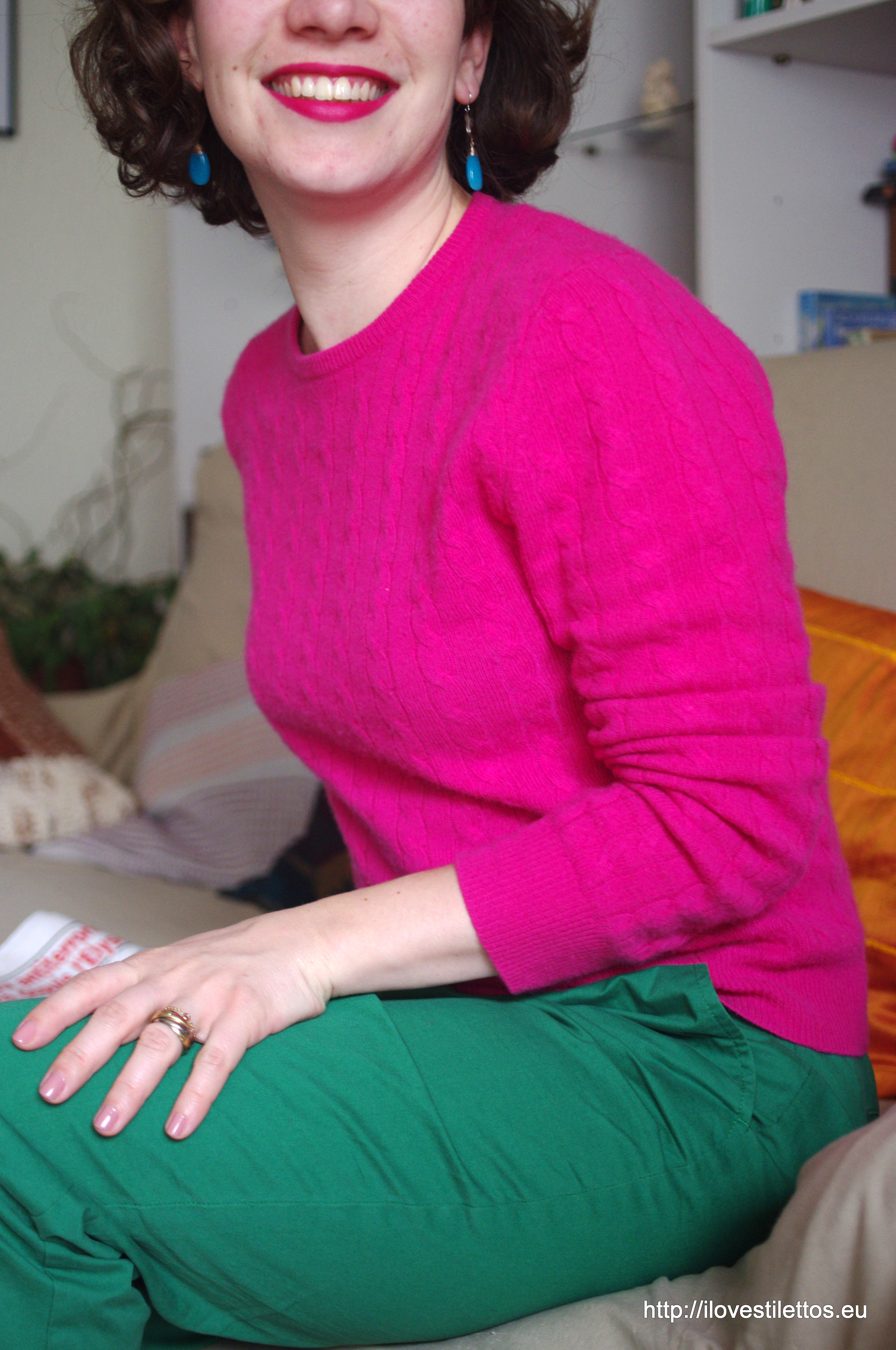 Printemps oblige j’ai envie de couleurs gaies, vives, pleines de vitamines. Bon, il fait 3° dehors, c’est donc un pull douillet en cachemire qui accompagne mon petit pantalon vert.