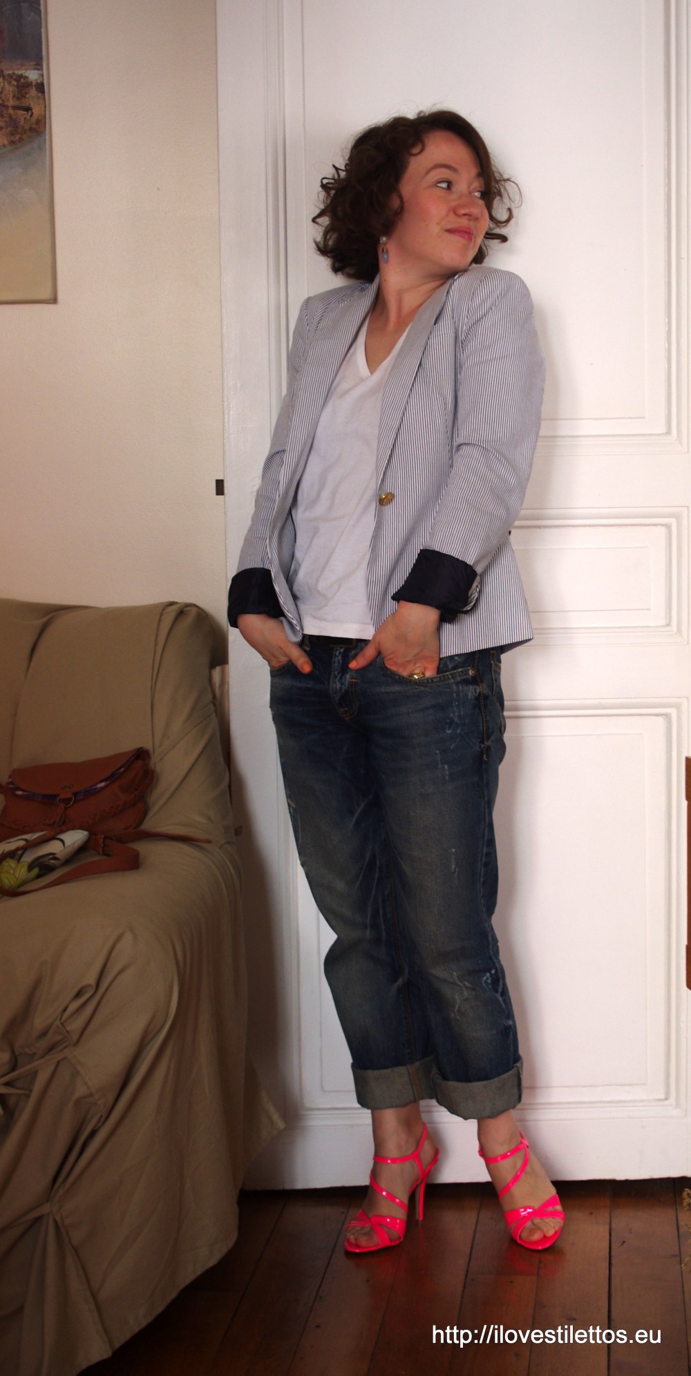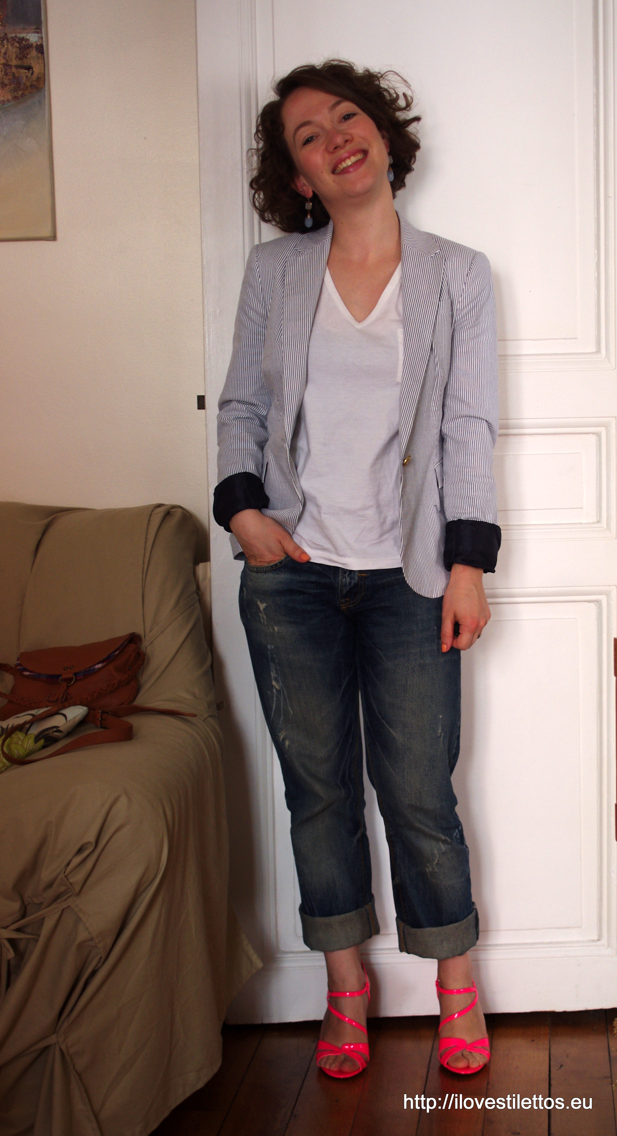 Veste Zara ; t-shirt Petit Bateau ; jean LTB Jeans ; sandales Guess (au Printemps Haussmann) ; BO Dusk by Icing Gifts ; sac Petite Mendigote pour Monoprix