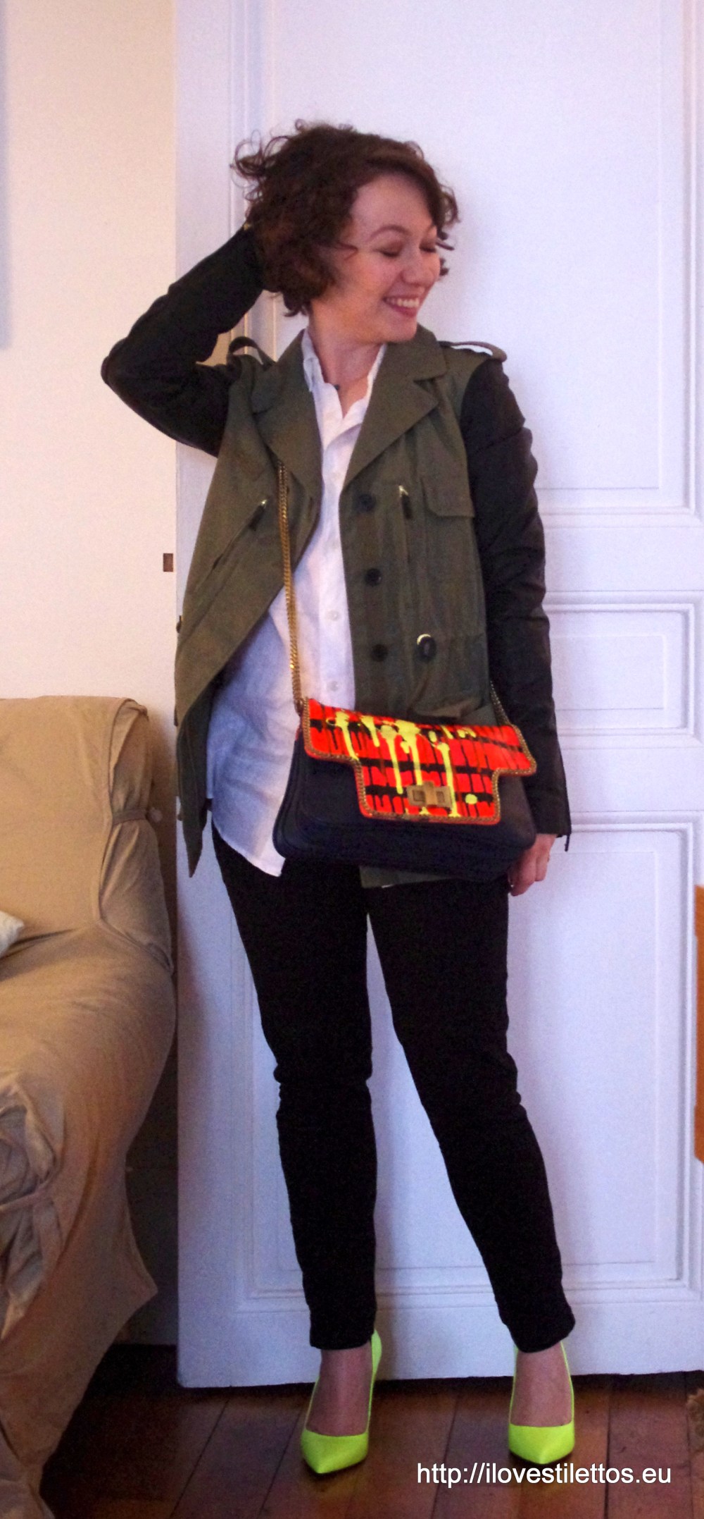 Tout le reste est hyper simple: jean noir, chemise blanche et veste kaki, ce sont le sac et les escarpins qui mènent la danse!