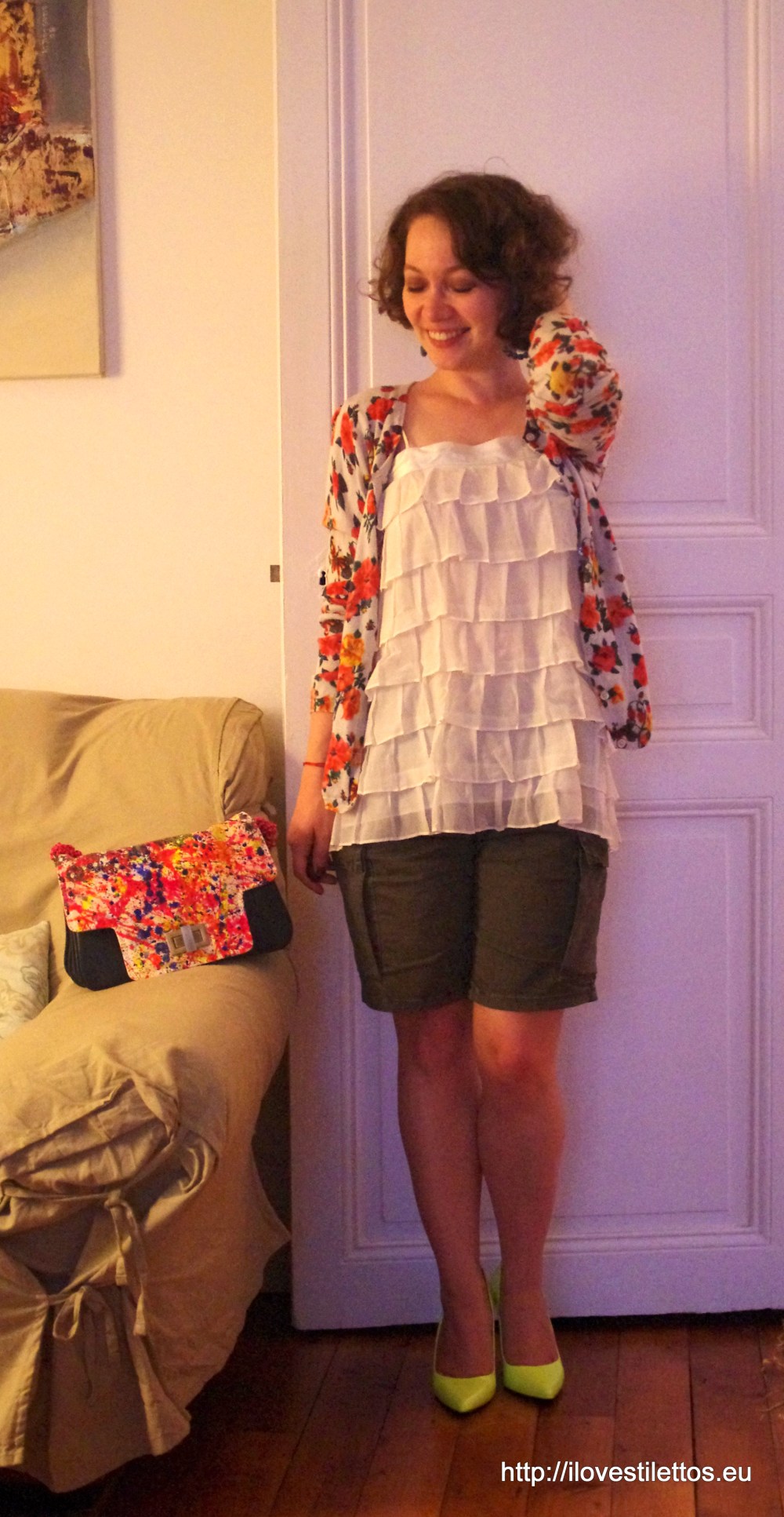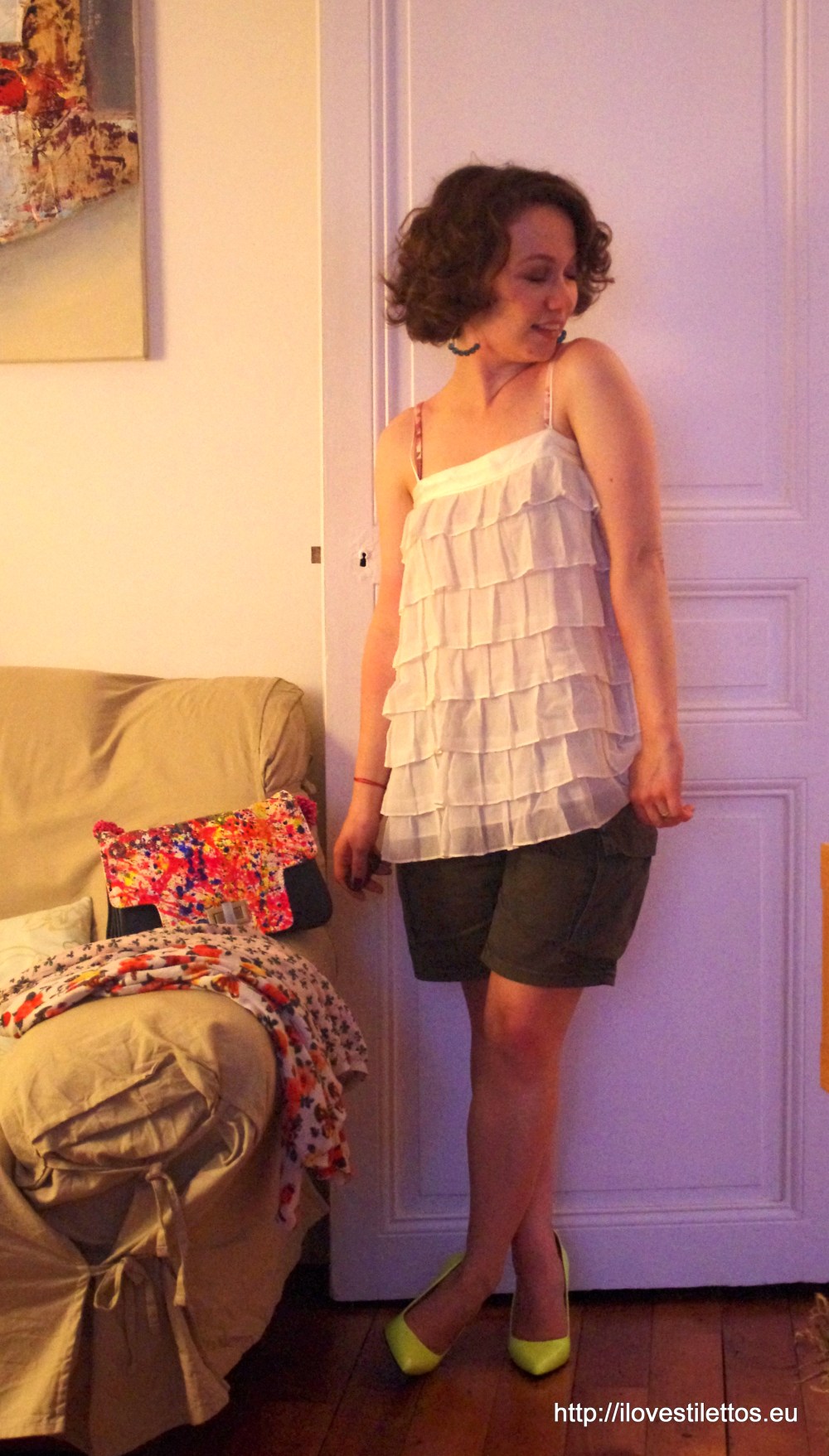 Top en soie Maje (The Biche ♥♥♥) ; short Used Jeans ; gilet Monop’ ; escarpins TMLS ; sac Madeleine Blondie’s Back x IRM Design ; bracelet Mitabaya ; BO Sarah Healy Design