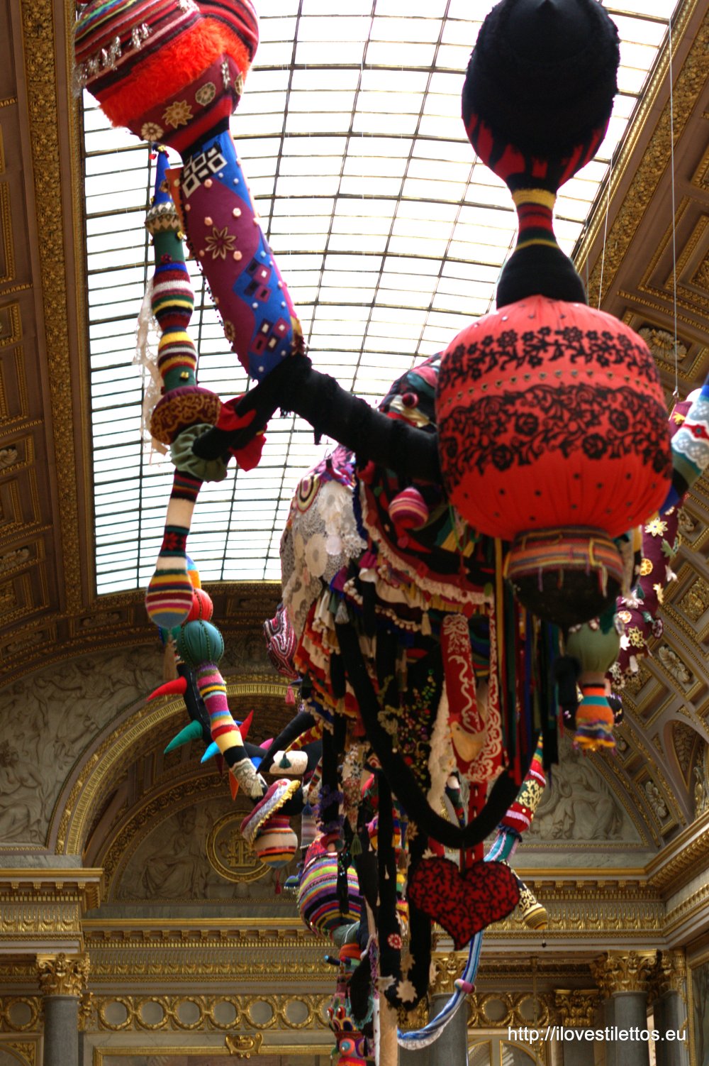 Joana Vasconcelos est la première artiste FEMME invitée à Versailles (révolution!!!!!!), et le moins que l’on puisse dire c’est qu’elle a su rendre hommage au lieu et à son histoire et tirer partie d’une manière extraordinaire de ce cadre fou et baroque qui accueille son exposition.