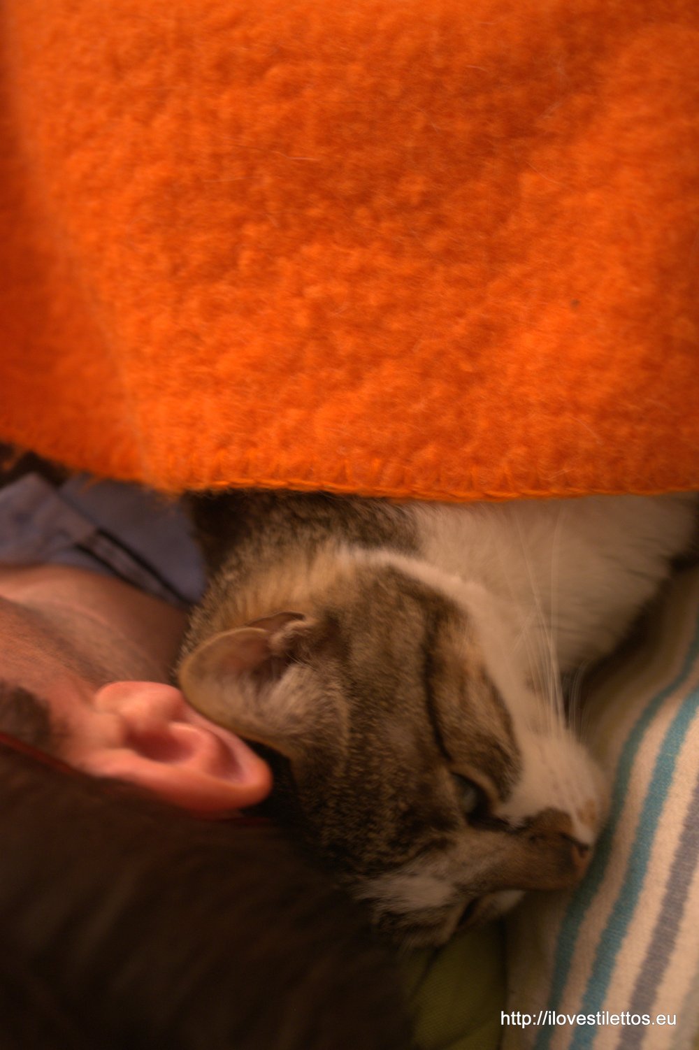 Comme promis la semaine dernière, voici les clichés de chaton installée sous sa couverture (Orange!!), bien calée contre son 2-patte le temps d’une soirée DVD.