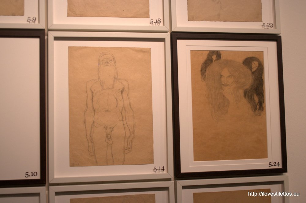 Parmi les dessins nous avons pu découvrir du travail préparatoire pour diverses œuvres majeures – dont « La Médecine » ou « La jurisprudence » aujourd’hui détruites (foutus SS, d’immondes c*nnards jusqu’au bout puisqu’ils ont détruits le château qui les abritaient en Mai 1945) – du maître mais aussi quelques uns de ses fabuleux dessins érotiques que Holly, Philomène et moi avions déjà admiré au Musée Maillol lors de l’exposition « Klimt, papiers érotiques » (où nous avions beaucoup, beaucoup ri en voyant des parents venir voir l’expo avec leurs enfants… les dessins de Klimt sont vraiment érotiques, pas juste un peu suggestifs :-)).