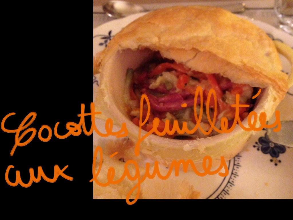 Des morceaux de poulet cuits en cocotte sous un couvercle de pâte feuilletée avec julienne de légumes et sauce au vin blanc.