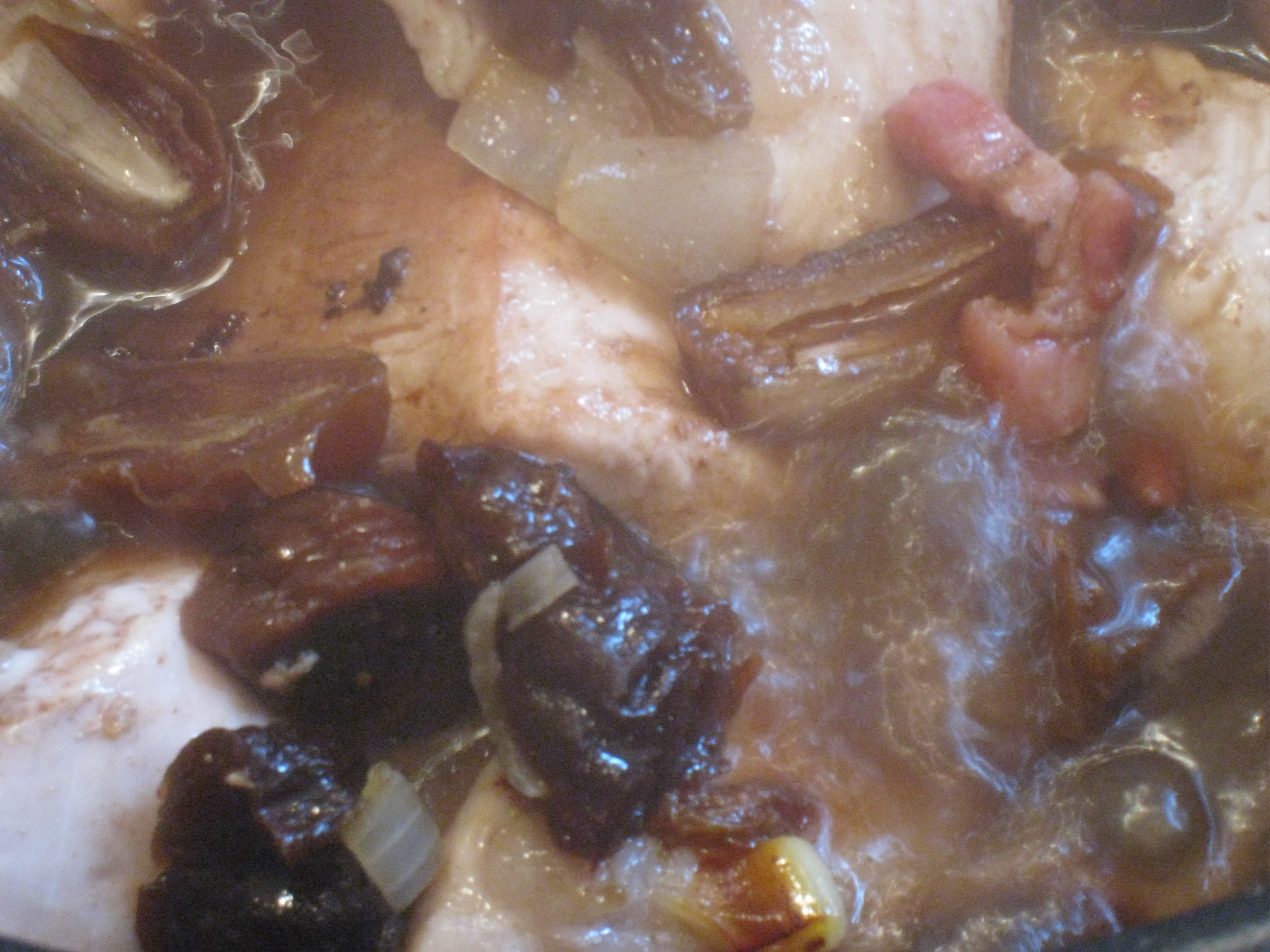 Couper en morceaux les fruits secs (dattes, abricots, figues) et les ajouter au bouillon frémissant avec les raisins secs, le laurier et le thym.